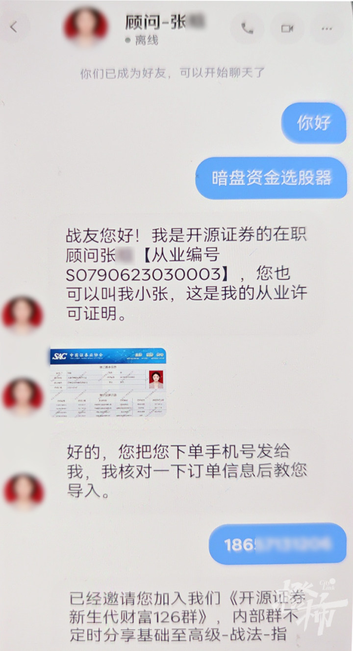 理财顾问“小张”在向童先生出示营业执照、从业许可证和工作证后将他拉进了分享技战法和股市内部消息的理财群。童先生观察了一段时间,感觉群里推荐的股票确实涨势不错,他决定先投个几万块试试水。
