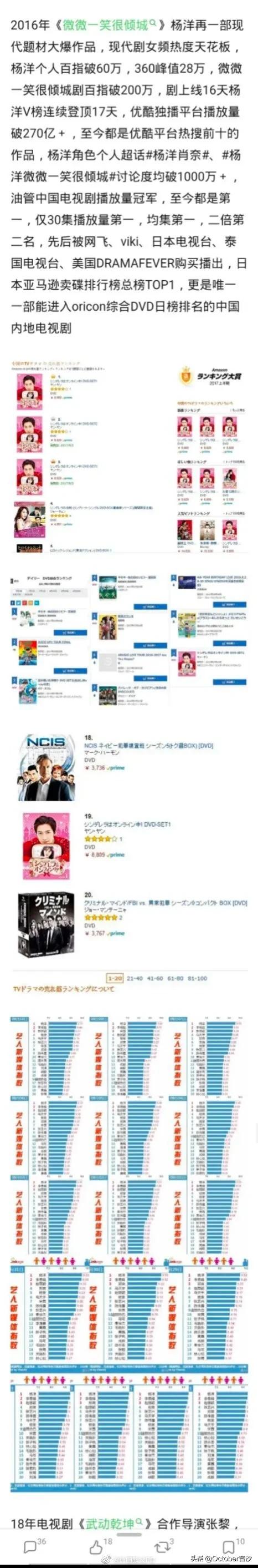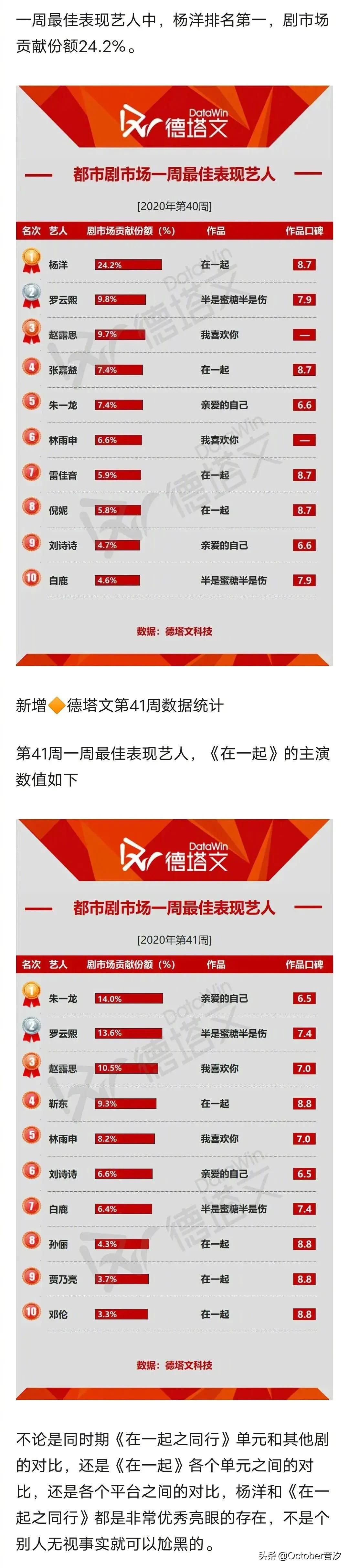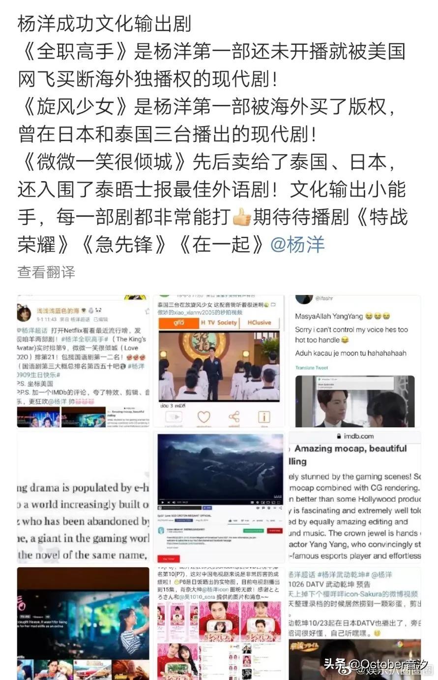 唯一现代剧三连爆男演员; 周播电视剧收视率历史前三, 唯一一部现代剧男演员…… 不论是《盗墓笔记》《微微一笑很倾城》,还是《旋风少女》《全职高手》……杨洋演什么剧,就火什么剧。 今年国庆期间,杨洋主演的《在一起之同行》,在正面碰上央视晚会的情况下,依然能拿下不俗的收视率,属实牛掰! 《在一起》所有单元剧中,杨洋热度指数全部第一。 更更牛掰的是,杨洋凭借《在一起》还成功斩获了德塔文电视剧景气指数周榜、德塔文都市剧最佳表现艺人周榜双榜TOP1! 《微微一笑很倾城》 国内偶像剧热度的天花板, 至今无剧可以打破! 国产剧油管播放量top1! 均集播放量超1700w+, 总播放量超50000w+, 时隔四年数据依旧能打! 实打实的数据,优秀的演员@杨洋 [心]