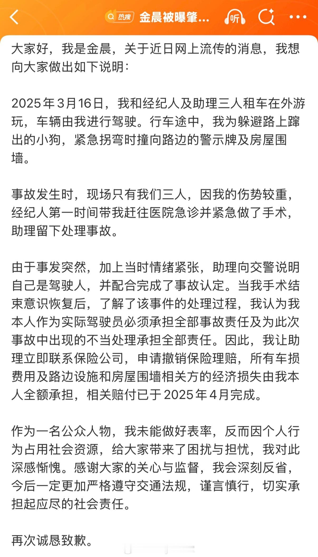 金晨发文道歉,并晒了自己当时受伤的照片:金晨道歉