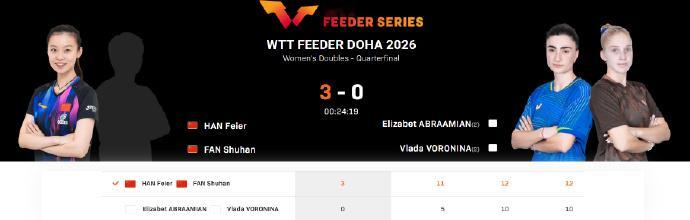 三对国乒组合晋级女双四强 WTT支线赛多哈站女双,杨屹韵/朱思冰、韩菲儿/范姝涵、覃予萱/纵歌曼分别以3-0的比分战胜对手,晋级四强。