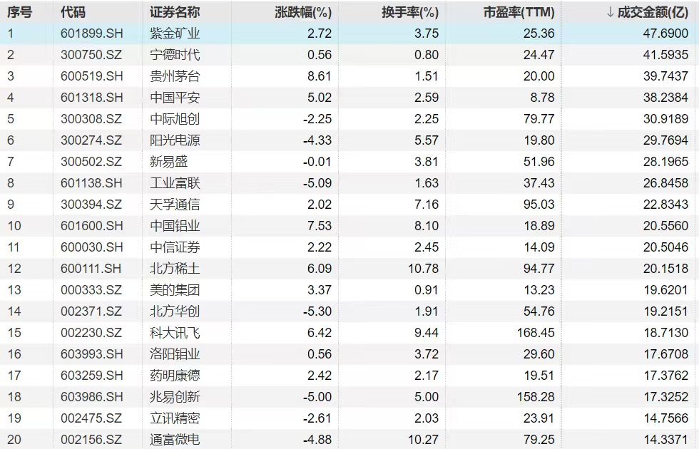 (3、个股)从个股来看,融资昨天净买入最多的是紫金,持续买入天孚通信 图18,买了点五粮液。卖出工业富联、中际和芯原寒武纪等。