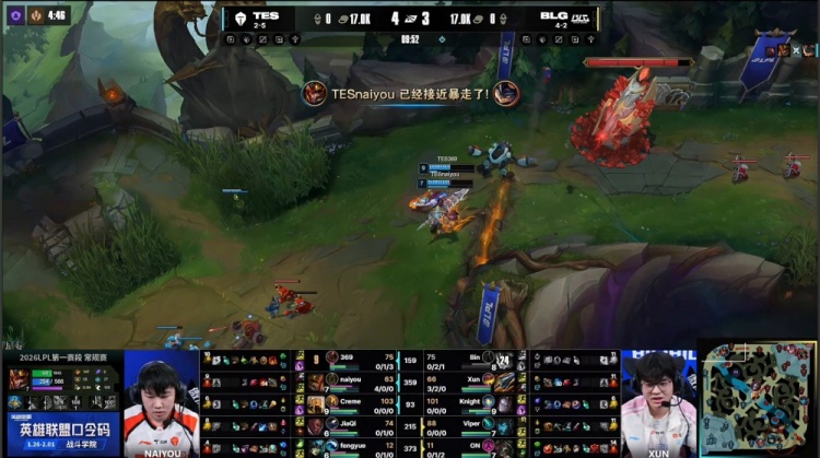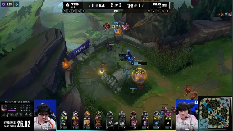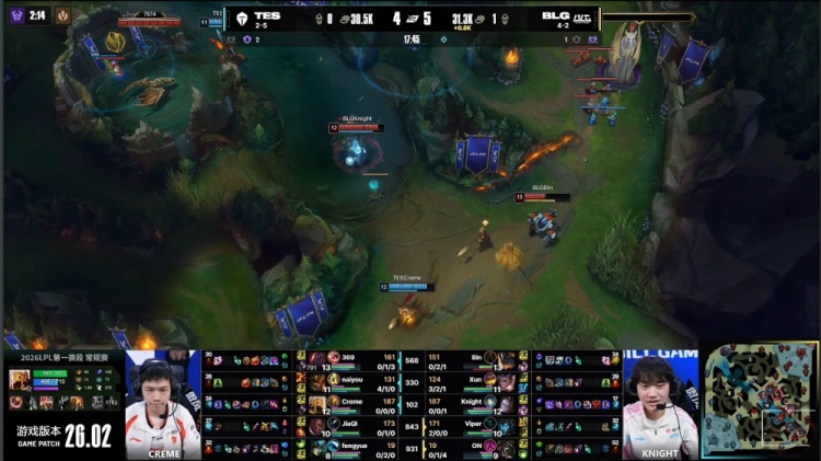 [20:32]河道团战,naiyou皇子见面又被秒杀,Creme沙皇推四人但自己也被击杀,369赛恩再次1v4被阿Bin烧烤,knight发条再拿一个人头,Xun赵信被换,BLG打出1换3,经济领先2k。