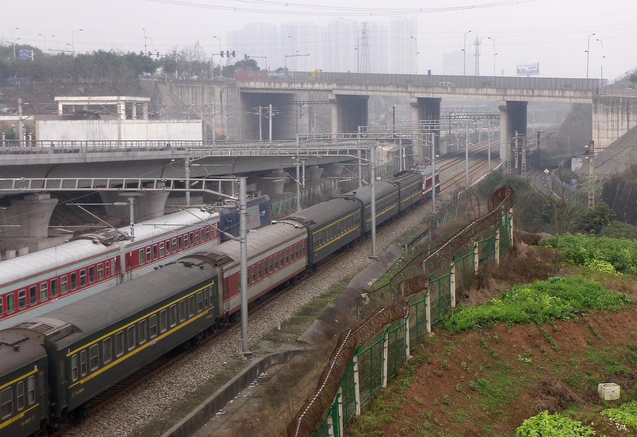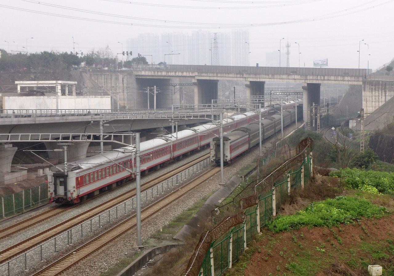 十年前在金渝大道跨线桥附近拍摄两趟不同线路上的普速客车同时经过此处,近处的列车是重庆北到汕头的K687次,远处的列车是成都东到长沙的K504次,K687次是运行渝怀线,从重庆北站南场发车,而K504次是运行渝利线,在重庆北站是经停北场,当时这两趟列车在重庆北站开车的时间一样,所以正点的情况下能看到两趟列车同时经过这里,当然渝怀线和渝利线并行一段后就分开了。