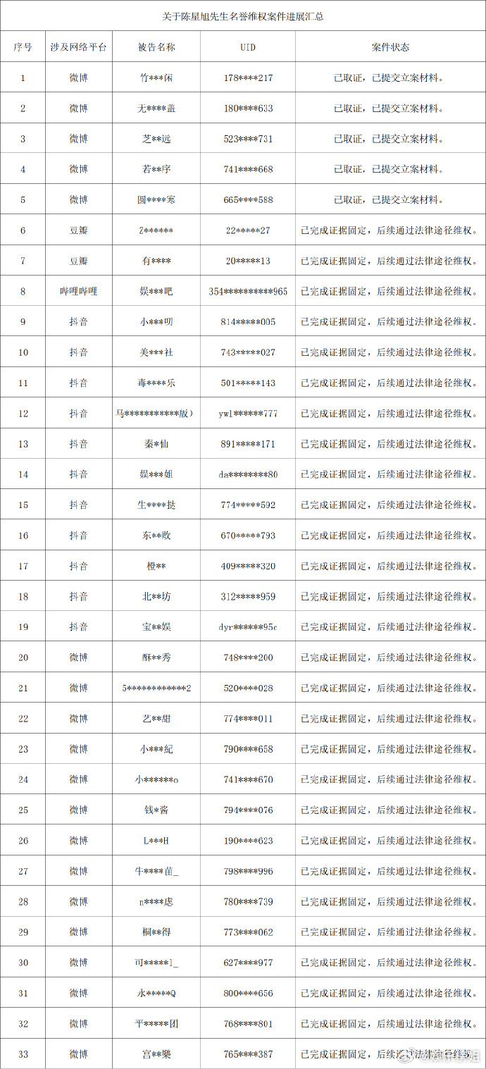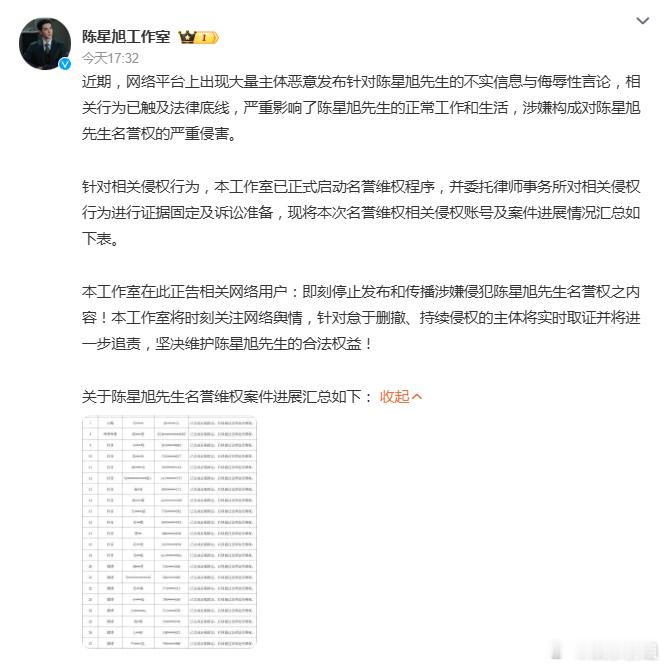 陈星旭名誉维权案件进展陈星旭工作室告黑了,并公布了名单,支持陈星旭维护自己的合法