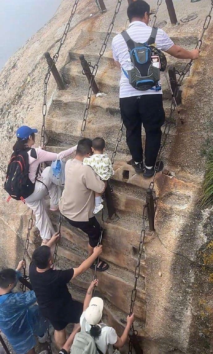 这是华山吧,抱这么小的孩子爬,是亲生的吗?!