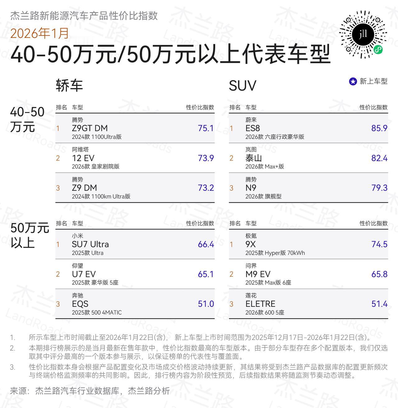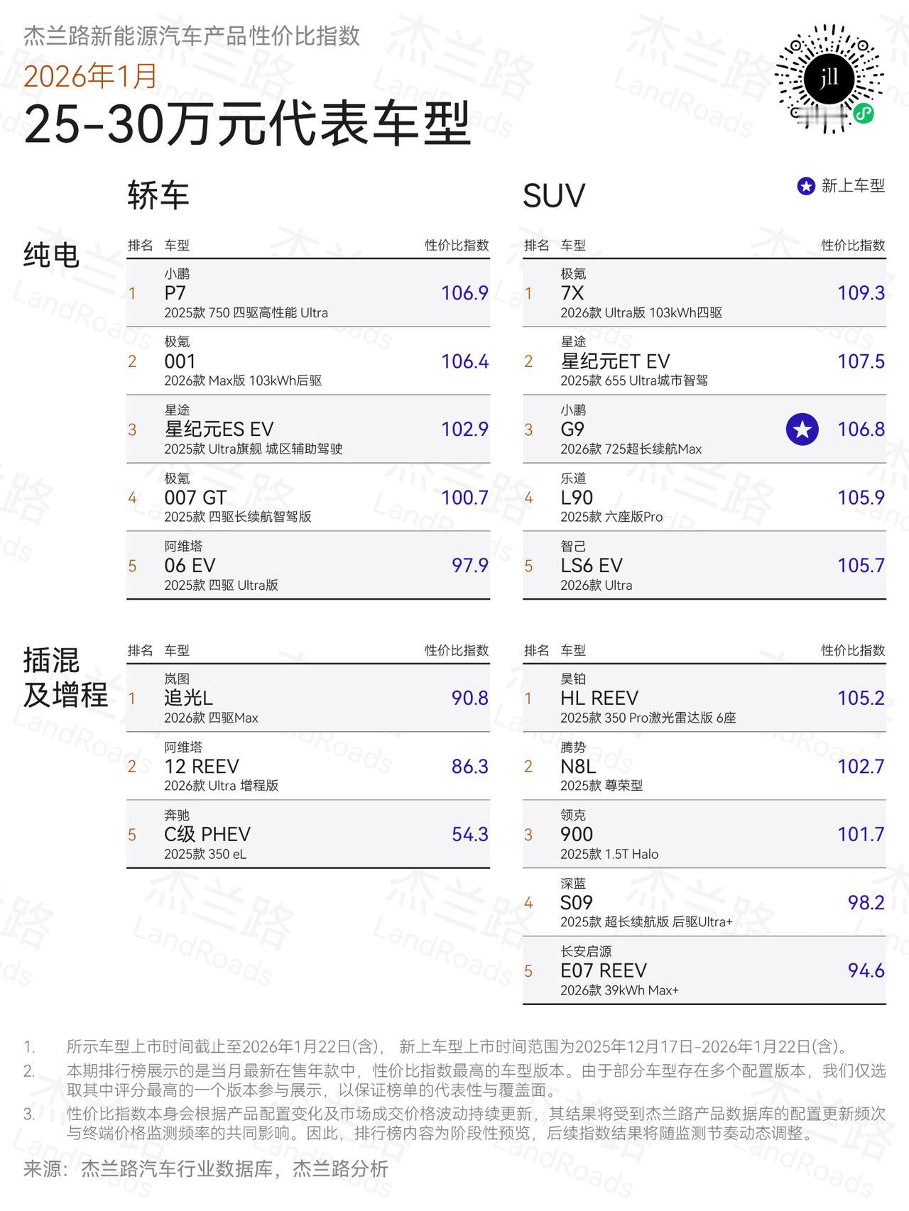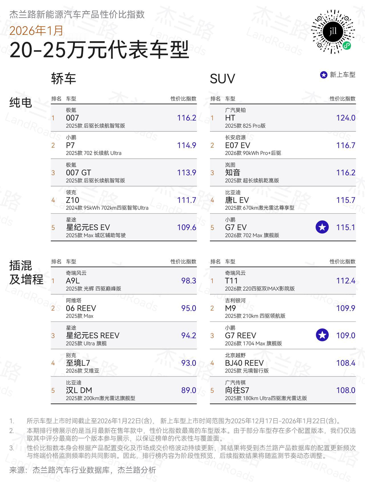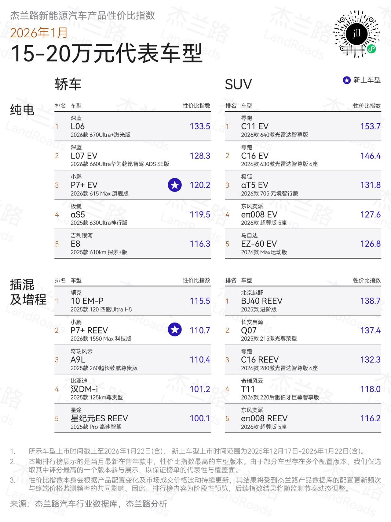 性价比肯定是消费者比较关心的,杰兰路发布了一期新能源汽车性价比排行榜: 5—10万轿车:MG4 EV,长安启源A05。SUV: 长安启源Q05,蓝电E5。面对头部的比亚迪,吉利星愿为大家树了个标杆,极高的性价比,我们消费者谁不喜欢便宜呢。 10—15万轿车:零跑Lafa5,海豹06。SUV:零跑C11,蓝电E5。零跑汽车的全栈自研,性价比路线是相当成功的,而且线下渠道铺的也相当快。 15—20万轿车:深蓝L06,领克10,SUV:零跑C11,BJ40。还是长安,吉利,零跑系,北京越野BJ40销量始终没有高企,有点可惜。 2026年买车,你会考虑啥品牌呢?【来自懂车帝车友圈】