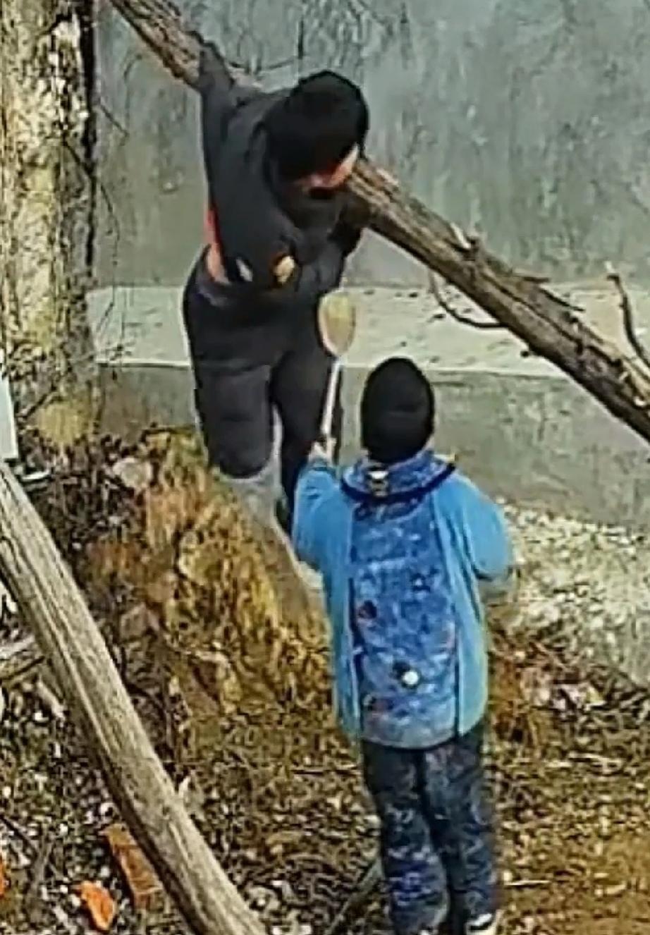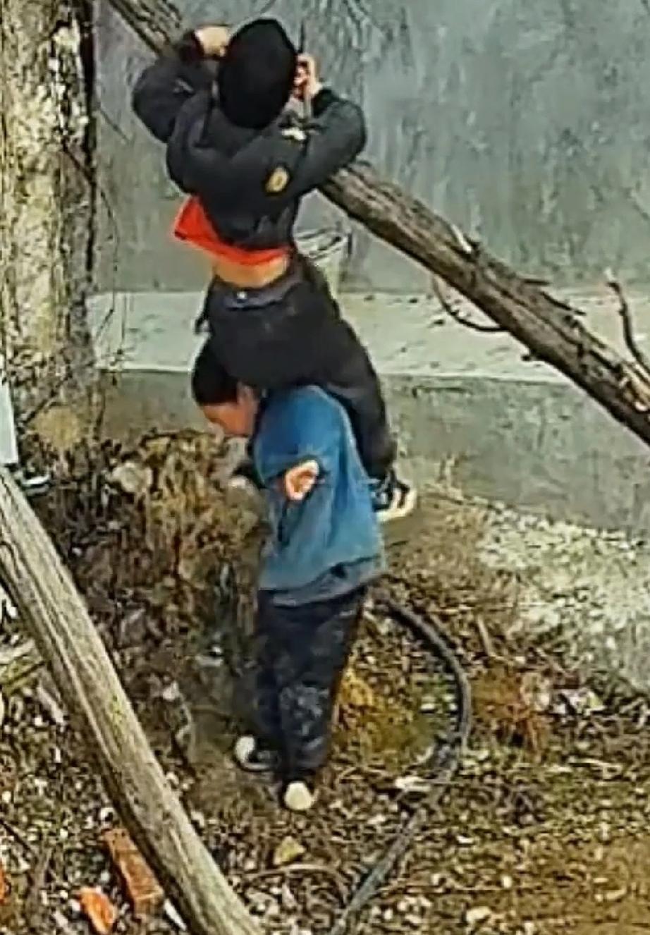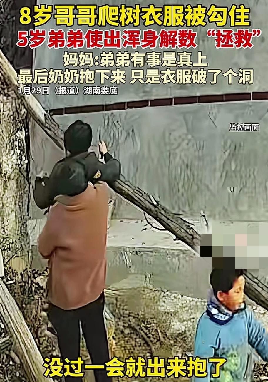 男孩大多数比较淘气,家里面常常会闹得个鸡飞狗跳。1月28日,天气寒冷,湖南娄底两个淘气包又开始折腾了。两个孩子像猴子一样,在树枝爬上爬下。衣服穿得厚,也不怕摔。 两兄弟在树枝上玩得不亦乐乎。哥哥爬上树枝,往下一跳。不料,衣服被树树挂住了,悬在空中晃来荡去的。上也上不去,下也不来。 弟弟看哥哥被挂,努力想办法解困。跑回厨房,拿了把锅铲,叫哥哥把衣服从树枝上拨开。哥哥的手够不着,此办法不行。 弟弟的脑袋鬼点子还是蛮多的。他又想了个办法,用自己的身体托举哥哥,让他自己解开。弟弟抱住他向上举,哥哥太重了,抱不动。他又让哥哥骑在肩膀上,脸憋得通红,努力站稳脚跟。哪知哥哥一转身,把他踢倒了。 最终,奶奶看到了,将哥哥抱下来。人没事,只是衣服破了洞。 童年的孩子调皮捣蛋,真不让大人省心。 哥哥贪玩不小心挂树上弟弟奋力推举 童年顽皮捣蛋的孩子