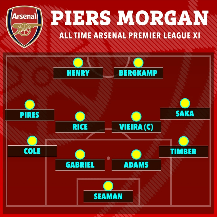 虎扑01月30日讯英格兰名嘴,阿森纳球迷皮尔斯-摩根今日发布社媒,他也评选出了阿森纳历史最佳11人,有萨卡等四名现役球员入选。具体名单如图。