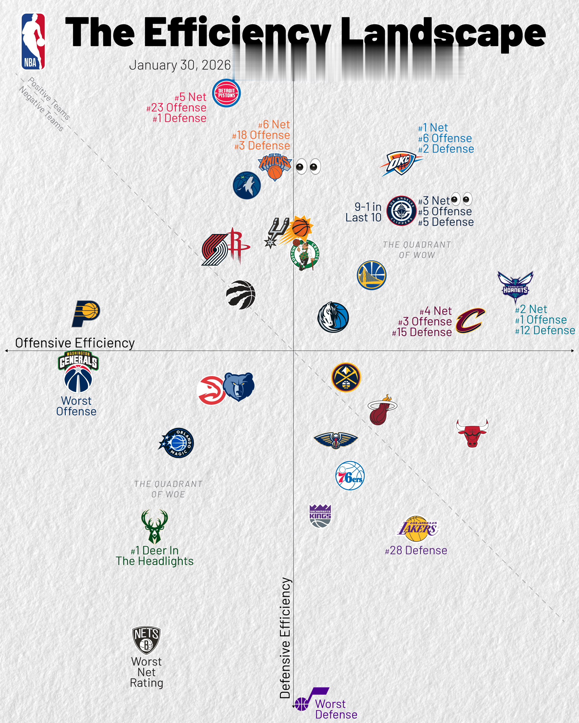 虎扑01月30日讯美记KirkGoldsberry制图晒出近10场联盟攻防效率图。