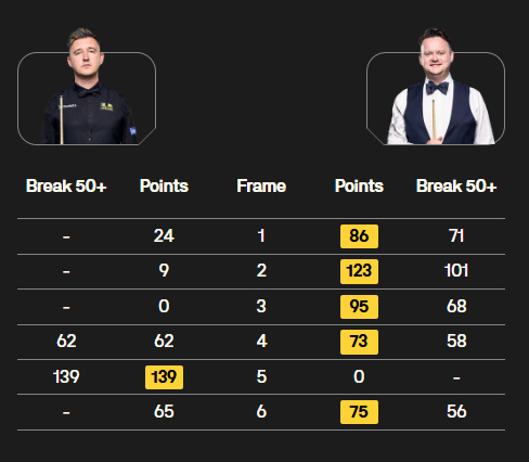 开局墨菲状态出色,以4-0领先威尔逊进入中场休息。休息归来威尔逊轰出139分的单杆破百扳回一局;第六局攻防战中,墨菲拼进长台咖啡球,清至粉球,最终5-1取胜,晋级半决赛。