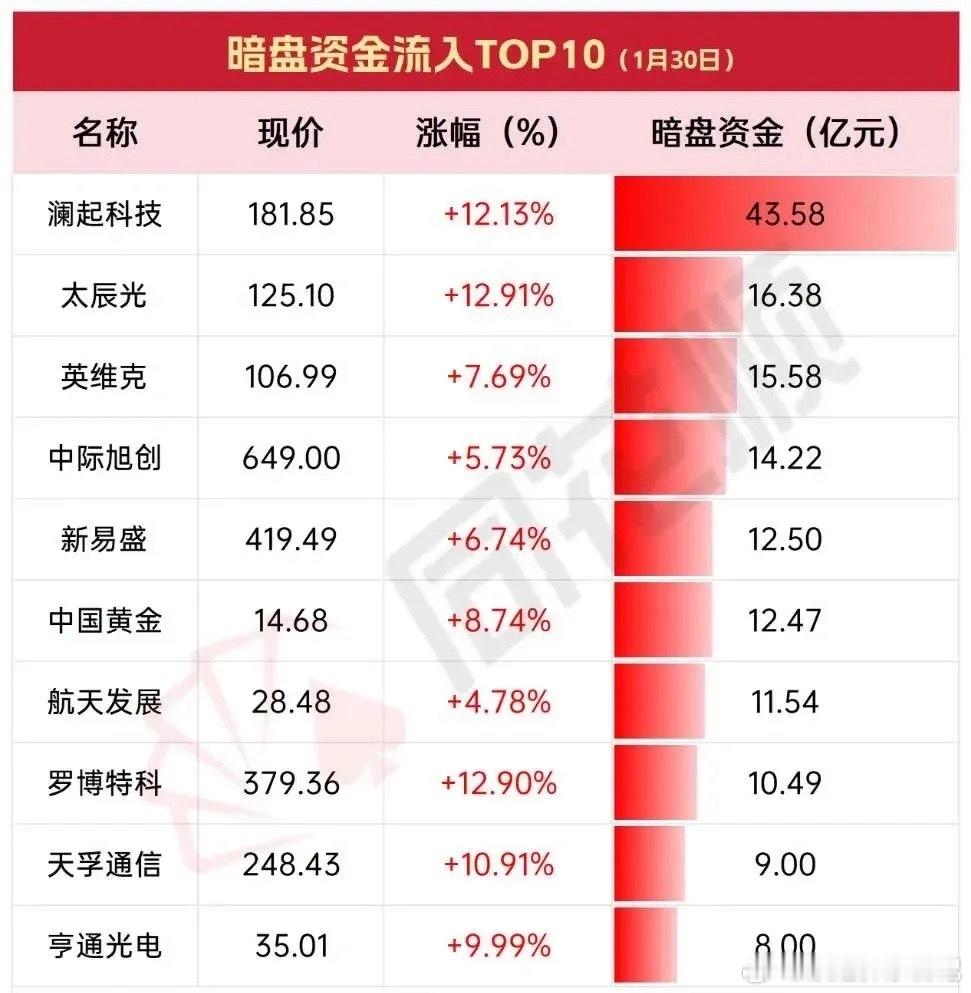 今日暗盘资金流入TOP10集中在光通信、算力、军工等高景气成长赛道,反映资金对科技产业趋势的强烈追捧;而流出TOP10则以资源类权重股和消费龙头为主,体现市场对高位周期、消费标的的短期获利了结,整体呈现“成长进攻+权重承压”的风格切换特征。暗盘资金流入个股梳理1. 澜起科技:主营内存接口芯片,是AI算力硬件核心供应商,受益于全球算力基建需求爆发,今日获43.58亿资金流入,涨超12%,技术面强势,后续关注国产替代进展与客户拓展。2. 太辰光:光通信器件龙头,产品覆盖光纤连接器、光分路器等,AI算力基建带动需求激增,获16.38亿资金流入,涨近13%,业绩弹性充足,需关注订单释放节奏。3. 英维克:温控设备核心厂商,专注于数据中心与储能温控系统,AI算力中心需求爆发推动业绩增长,获15.58亿资金流入,涨7.69%,绑定头部客户,成长确定性较强。4. 中际旭创:全球光模块龙头,800G/1.6T光模块量产领先,AI算力需求驱动订单放量,获14.22亿资金流入,涨5.73%,产能扩张加速,业绩增长动能充足。5. 新易盛:光模块核心厂商,产品覆盖数通与电信市场,受益于AI算力基建,获12.50亿资金流入,涨6.74%,海外客户订单放量,技术迭代速度领先行业。6. 中国黄金:黄金零售龙头,依托品牌与渠道优势,金价上行周期下业绩弹性凸显,获12.47亿资金流入,涨8.74%,渠道扩张加速,具备避险属性与成长空间。7. 航天发展:军工电子龙头,聚焦电子蓝军与网信装备,信息化装备需求增长推动订单释放,获11.54亿资金流入,涨4.78%,军工景气度提升,成长动能充足。8. 罗博特科:光伏与半导体设备双轮驱动,以AI+制造赋能高端装备业务,获10.49亿资金流入,涨近13%,技术壁垒较高,下游需求旺盛,成长空间广阔。9. 天孚通信:光器件核心厂商,产品覆盖高速光引擎等AI算力核心部件,获9.00亿资金流入,涨近11%,客户覆盖全球头部厂商,业绩增长确定性强。10. 亨通光电:光通信与海洋工程龙头,AI算力基建需求推动光模块业务放量,获8.00亿资金流入涨停,产能扩张加速,技术实力领先,成长潜力突出。暗盘资金流出个股梳理1. 中国铝业:国内铝业龙头,主营电解铝与氧化铝,今日遭23.12亿资金流出跌停,短期受大宗商品波动与板块调整影响,后续需关注铝价走势与产能调控政策。2. 紫金矿业:全球矿业巨头,拥有丰富金铜锌资源储备,遭17.39亿资金流出,股价跌7.62%,金价上行但短期承压,需关注海外矿企复产进度与金属价格联动。3. 洛阳钼业:全球钼钨龙头,布局铜钴等新能源金属,遭11.15亿资金流出跌停,短期受板块调整拖累,需关注新能源金属需求变化与库存周期。4. 北方稀土:国内稀土龙头,主营冶炼分离业务,遭9.40亿资金流出,股价跌8.06%,需关注稀土收储政策与下游磁材需求回暖节奏。5. 包钢股份:钢铁与稀土资源双主业,遭9.25亿资金流出,股价跌6.34%,短期受行业周期调整影响,需关注钢材与稀土价格联动。6. 江西铜业:国内铜业龙头,主营铜冶炼与加工,遭9.04亿资金流出跌停,需关注全球铜矿供给与新能源需求共振下的铜价走势。7. 五粮液:高端白酒龙头,遭8.74亿资金流出,股价跌5.21%,春节动销预期较强但短期承压,需关注渠道库存与批价稳定性。8. 贵州茅台:白酒行业绝对龙头,遭8.60亿资金流出,股价跌2.55%,短期资金流出但基本面稳健,需关注高端消费需求变化。9. 华友钴业:全球钴业龙头,布局锂电材料业务,遭7.89亿资金流出,股价跌8.40%,需关注锂钴价格与下游动力电池需求变化。10. 铜陵有色:国内铜冶炼龙头,主营铜锌金属,遭7.75亿资金流出跌停,短期受大宗商品波动影响,后续需关注铜价走势与产能释放节奏。总结当前市场资金正从资源、消费等传统权重股向光通信、算力、军工等高景气成长赛道切换,反映了投资者对产业趋势与业绩弹性的追逐。策略上可侧重低估值成长标的与高景气赛道的均衡配置,同时需警惕权重股波动对市场指数的传导影响,短期交易可关注资金流入的科技龙头,中长期仍需结合业绩验证与估值匹配度筛选标的。