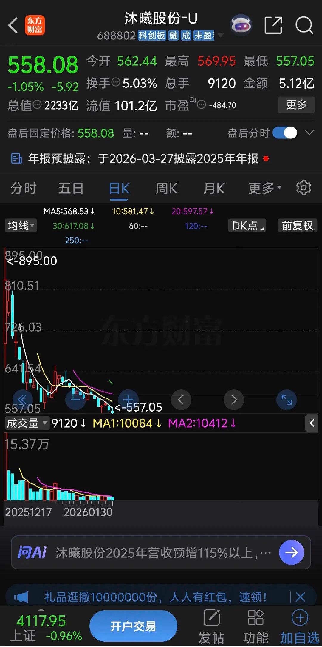 沐曦股份跌的太惨了,上市暴涨一天后持续下跌,今天盘中跌破558再创新低。第一波下跌跌到566后反弹了几天,但是仅到655就开始持续下跌,离高点895有相当远的距离。周线看最近连续下跌了3周,日线看成交量越来越小,越来越多股民离场,成交额快速回落到10亿内,都去炒其他题材股了,估计很难回来了,追高股民惨不忍睹。