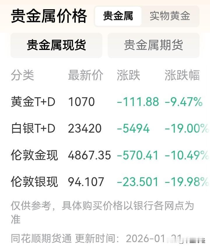 【贵金属:此时此刻!大跌!】持有贵金属的投资者现在估计慌得一批。最近贵金属市场风云变幻,价格波动那叫一个剧烈。就说黄金白银,之前涨势凶猛,吸引了不少投资者入场。可最近这行情急转直下,市场上各种不确定性增加,经济形势、政策变动都影响着贵金属价格。下周这板块看着就危险,要是再来点利空消息,价格很可能继续下探。那些高位买入的投资者,估计这会儿肠子都悔青了,心里七上八下的。只能祈祷下周行情能好点,不然这损失可就大了。 白银贵金属 贵金属 贵金属行情走势