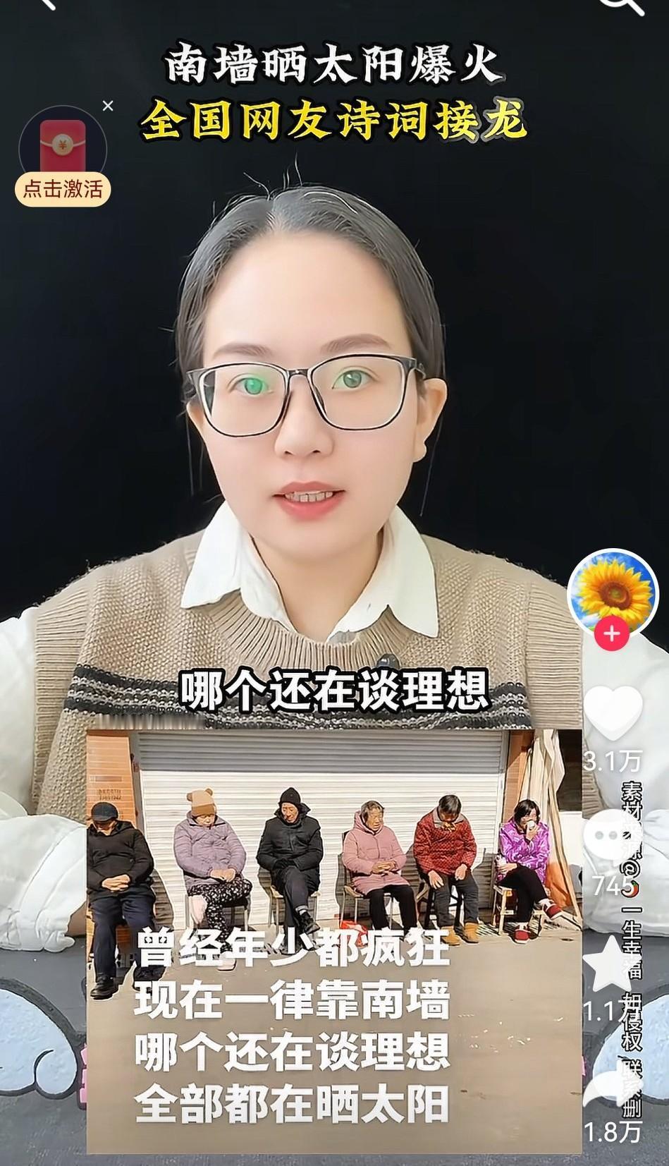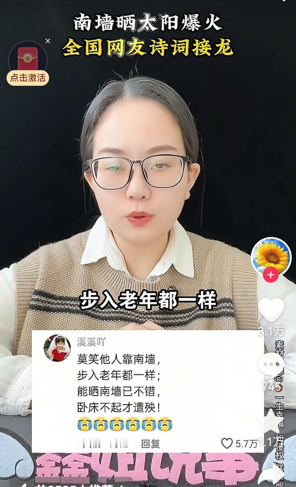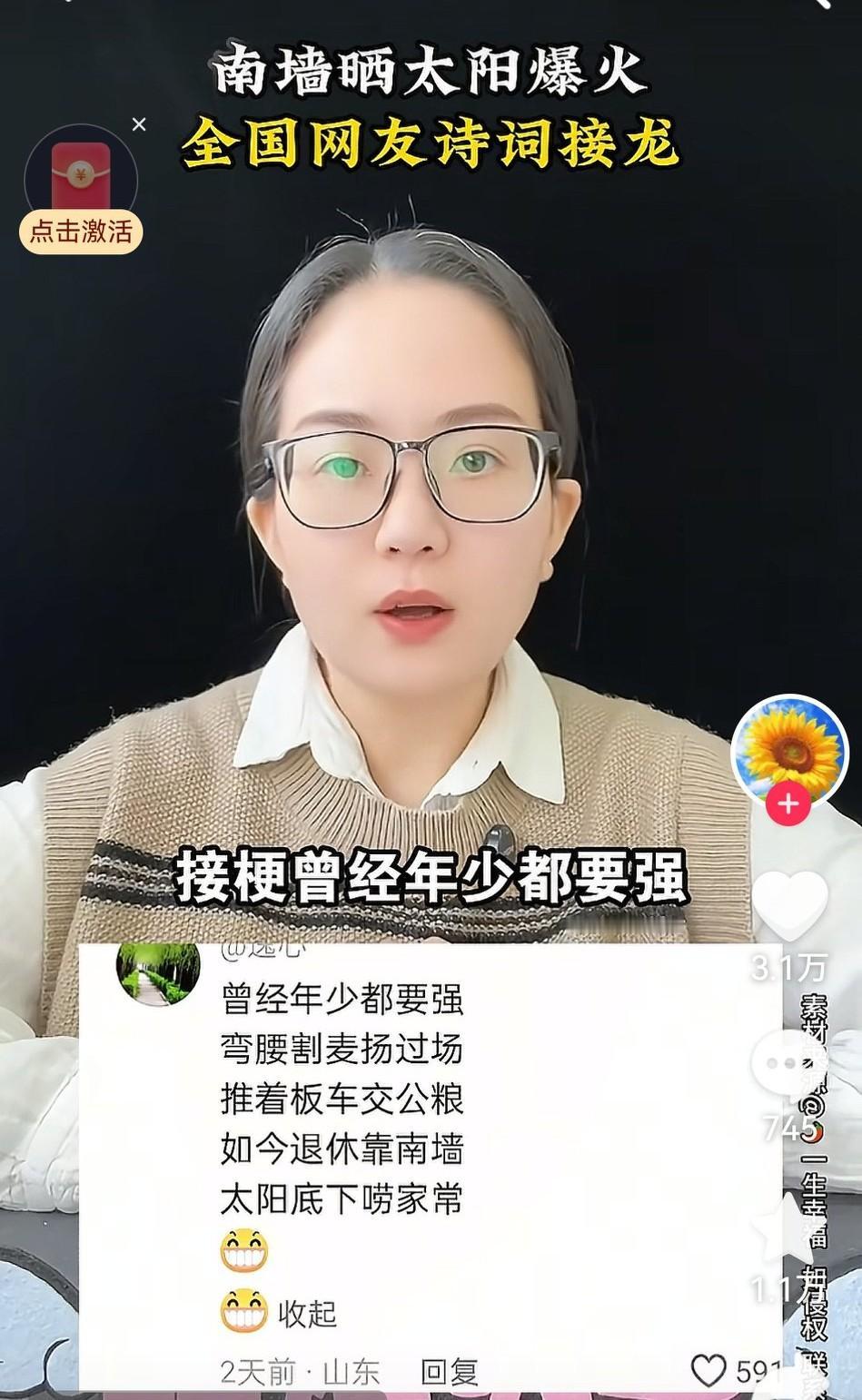火遍全网的“南墙晒太阳”:一首打油诗,戳中了多少中国人的柔软 最近刷短视频,被一个“南墙晒太阳”的梗刷屏了。 一条“一排老人坐在南墙根下晒太阳”的视频,配上一首打油诗: 曾经年少都疯狂 现在一律靠南墙 哪个还在谈理想 全部都在晒太阳 短短几句话,瞬间引爆了全国网友的创作欲,评论区里全是接梗的打油诗,看得人又笑又心酸。 这首打油诗,为什么能戳中我们? 它之所以火,不是因为写得多好,而是因为它写得太真实了。 藏着一代人的青春与归途:“曾经年少都疯狂”是我们每个人的过往,不管是割麦交公粮的老一辈,还是为生活奔波的年轻人,都有过热血和理想。 “现在一律靠南墙”是我们终将面对的归途,谁也逃不过岁月的打磨。 道尽了普通人的生活哲学:没有抱怨,没有不甘,只有一句“全部都在晒太阳”的释然。 这不是躺平,而是经历过生活起落之后,学会了在平凡里找温暖。就像网友接的梗:“莫笑他人靠南墙,步入老年都一样;能晒南墙已不错,卧床不起才遭殃。” 唤起了集体的情感共鸣:在越来越快的时代里,我们都在赶路,却忘了偶尔停下来晒晒太阳。这个梗让我们想起了老家的父母,想起了自己未来的样子,也想起了生活最本真的模样。 网友的神级接梗,全是生活的智慧 这场全民诗词接龙里,藏着太多普通人的幽默与通透: 怀旧版:“曾经年少都要强,弯腰割麦扬过场,推着板车交公粮,如今退休靠南墙,太阳底下唠家常。” 现实版:“当年村里闹哄哄,如今村里到处空,学校不见一个童,南墙靠着一片翁。” 通透版:“莫笑他人靠南墙,人生不过梦一场,功名利禄随风去,平安健康才是强。” 这些打油诗没有华丽的辞藻,却句句都是生活的沉淀。它们用最接地气的方式,告诉我们:平凡的日子,也能过得有滋有味。 其实,我们每个人的人生,都是从“疯狂”走向“南墙”的过程。重要的不是有没有理想,而是有没有学会和生活和解。 就像南墙根下的老人,晒着太阳,聊着家常,这就是最踏实的幸福。 你最戳心的是哪一句?如果让你接梗,你会怎么写?评论区秀出你的才华吧! (内容取材网络) 点亮〔收藏和赞〕你我共同成长