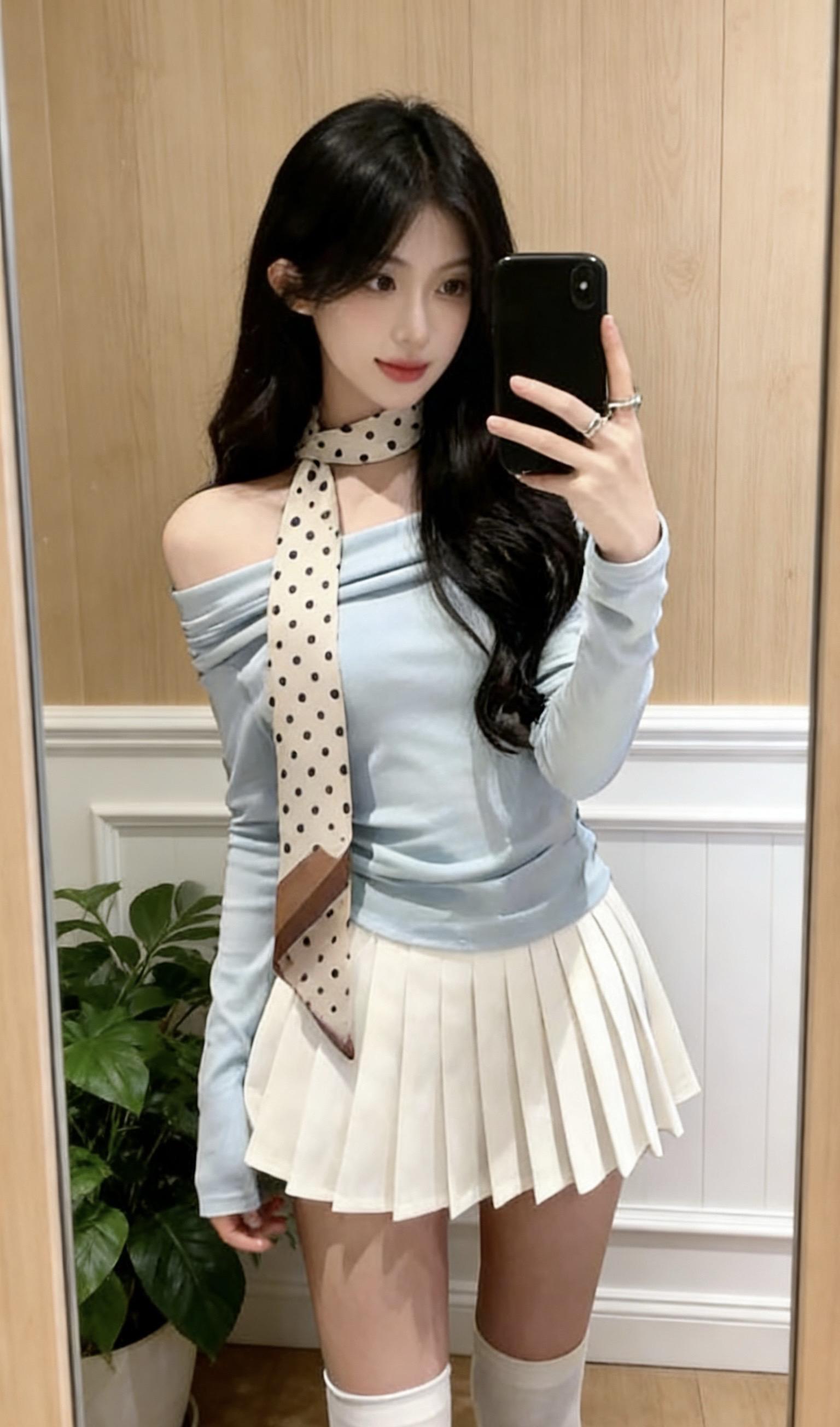 一字肩上衣 半身裙 百褶裙 两件套女装 上衣