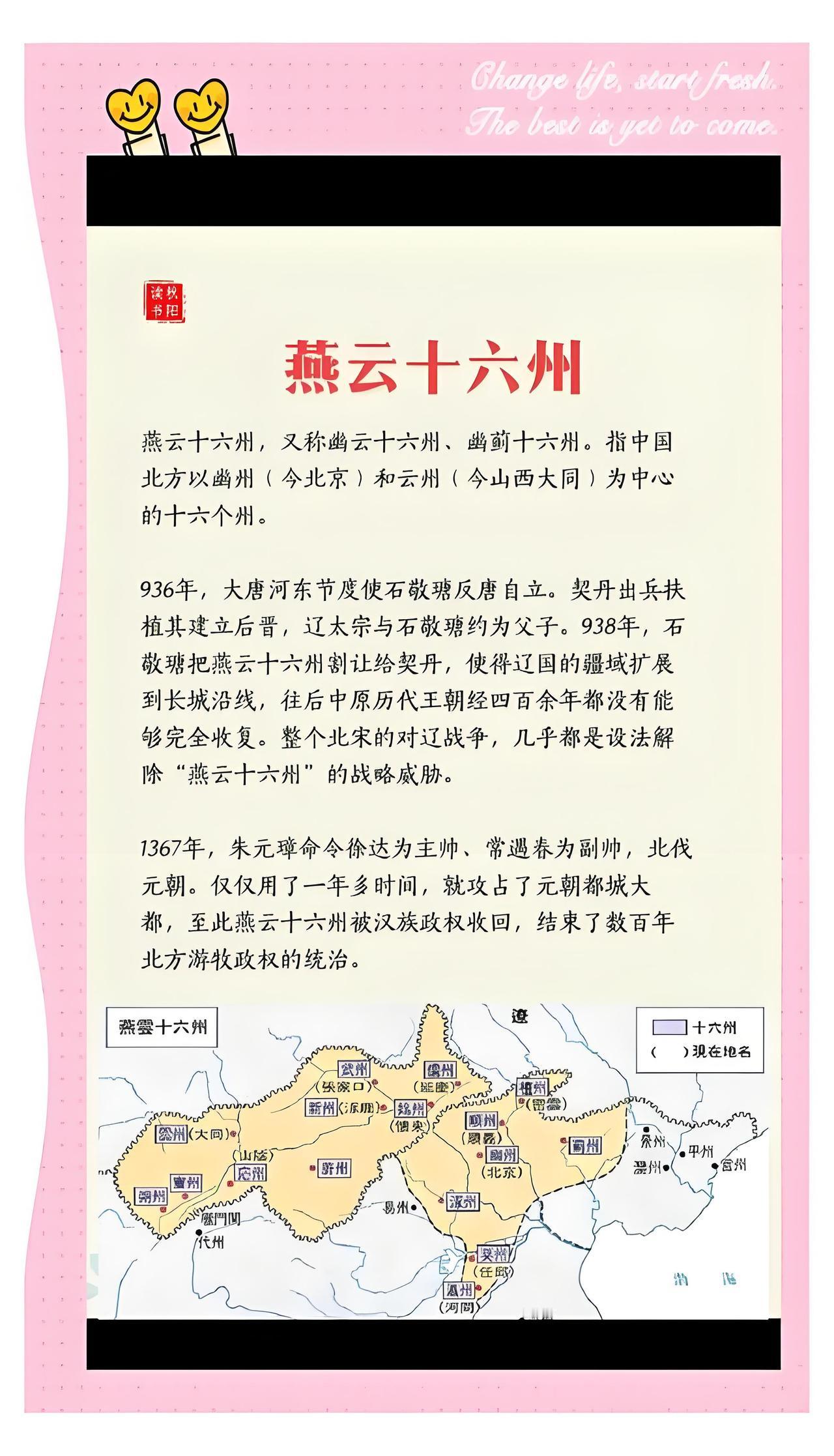 大家好,我是你的历史科普博主。今天我们来聊一个震动千年的历史事件——“割让燕云十六州”。这段历史不仅关乎一段地理的变迁,更牵扯出复杂的权谋斗争、民族存亡的重大抉择。到底为什么会发生这样的事情?背后隐藏着怎样的秘密?让我们一探究竟! “燕云十六州”指的是今天河北、山西、内蒙古等地区的一大片土地,历史上曾是北方游牧民族与中原汉族的交汇地。唐代时,这片地区经济繁荣,战略重要性极高。然而,到了宋朝时期,这片土地成为北方边防的关键区域。历史 公元1127年,金朝(女真族建立的国家)攻占北宋首都汴京(今开封),宋朝南迁,史称“靖康之耻”。在战败后,南宋政府为了暂时稳定局势,与金朝签订了《绍兴和议》。在这份条约中,南宋割让了“燕云十六州”给金朝,换取短暂的和平。 这次割让,成为历史上的重大转折点。南宋政府以“和为贵”,放弃了北方大片领土,但也引发了后世的巨大争议:这是屈辱的投降,还是战略的权衡? 南宋面对金朝的强大军事压力,内部又需稳住江南地区的统治。割让燕云十六州,虽然意味着失去北方的土地,但换来了宝贵的和平与生存空间。 金朝则希望借此巩固北方边疆,扩展领土,建立更稳固的统治。 燕云十六州的割让,也引发了汉族与女真族之间的复杂关系,成为民族认同与历史记忆中的痛点。 对于这段历史,评价众说纷纭。有学者认为南宋的割让是“不得已而为之”的战略选择,是在强敌压境下的权衡取舍;也有人批评这是“屈辱的投降”,给国家带来了无法弥补的损失。 其实,历史没有绝对的对错。每一个决策都在特定的时代背景下做出,折射出当时的无奈与智慧。 “割让燕云十六州”告诉我们,国家的存亡不仅仅是军事的胜负,更关乎战略的智慧和民族的韧性。面对困难时,如何权衡利弊、做出最优选择,是每一个时代都需要深思的问题。 历史是一面镜子,照亮未来的路。理解“燕云十六州”的故事,不只是了解一段地理变迁,更是洞察人性与国家命运的深刻启示。