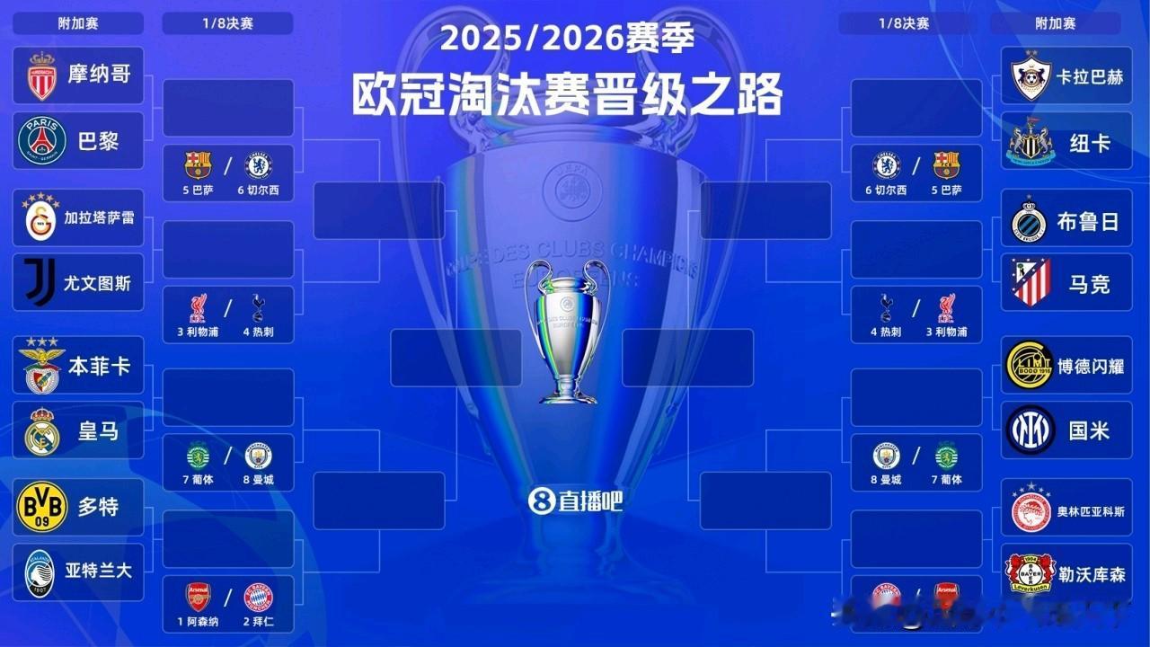一目了然,欧冠淘汰赛巴黎不是碰车子就是巴萨,而皇马过了本菲卡肯定就是曼城,欧足联安排得明明白白的。 如果豪门球队都顺利晋级,那么欧冠16强可能会产生巴黎vs切尔西/巴萨、尤文/马竞vs利物浦/热刺、皇马/国米vs曼城等焦点对决。 不过我觉得16进8应该更大概率是巴萨vs纽卡,因为3月15英超有一场切尔西对纽卡,如果欧冠再来就一周三次切龟纽卡,会影响收视率的。