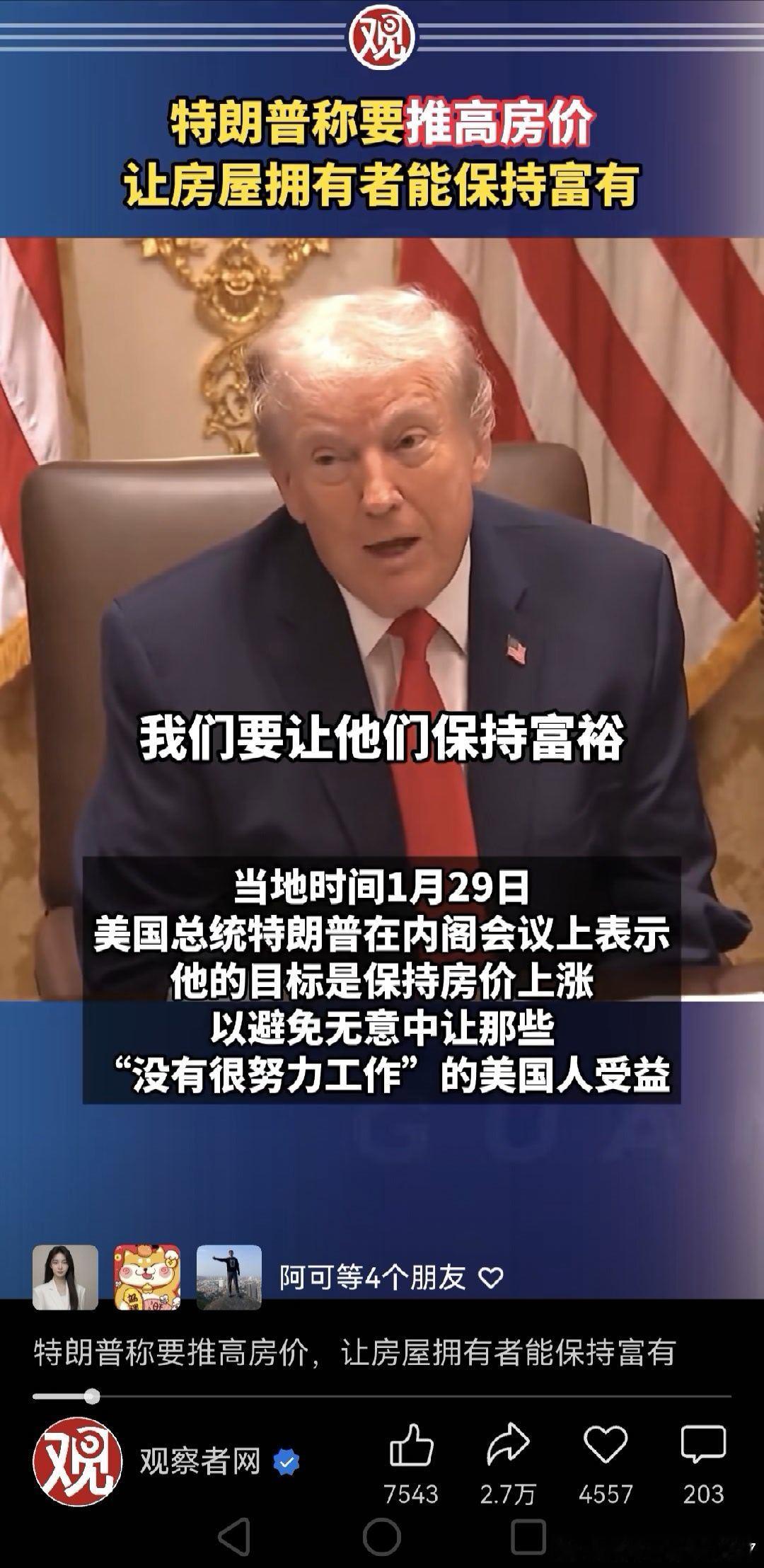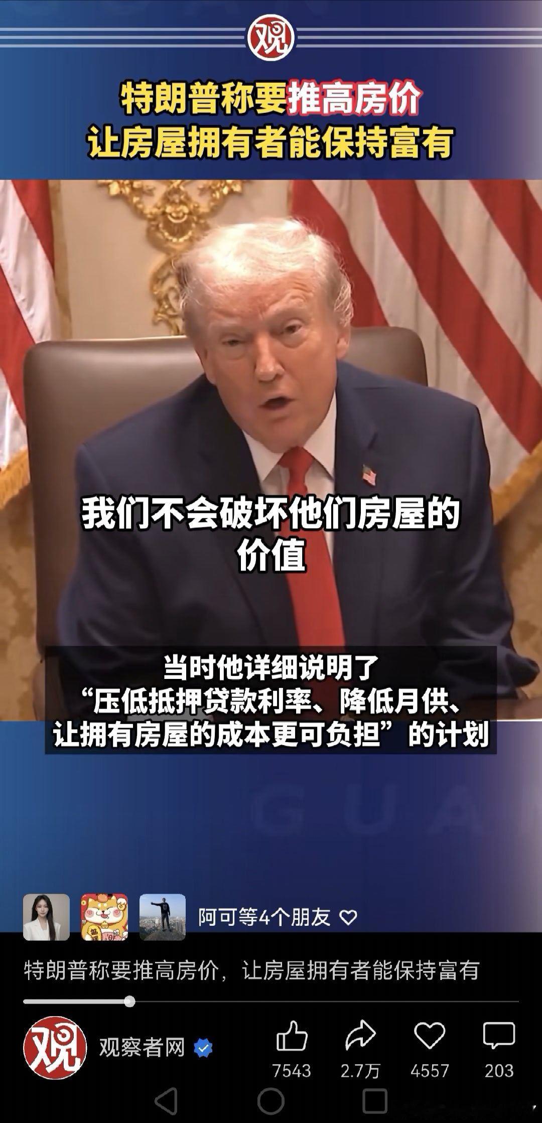 特朗普称要推高房价,让房屋拥有者保持富裕,不会破坏他们房屋的价值。