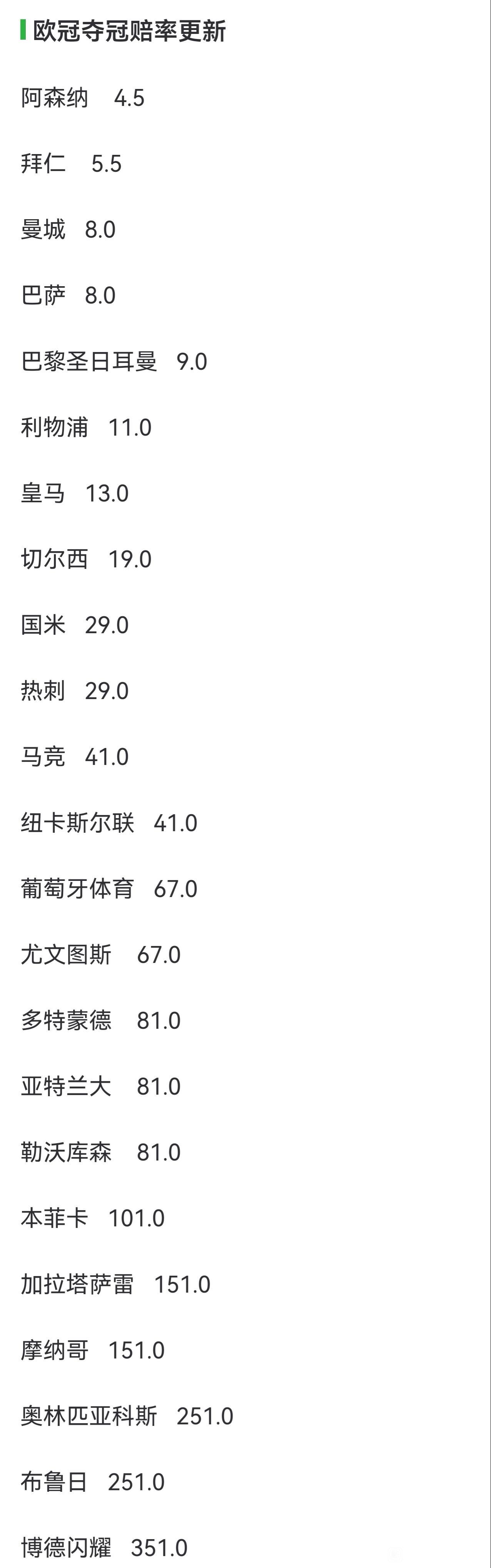两份最新欧冠夺冠概率,阿森纳,拜仁,曼城都排第四。 利物浦,切尔西,巴萨,皇马还是热门。 今年万众期待就是阿森纳vs拜仁,英超第一和德甲第一的终极较量。[偷笑]