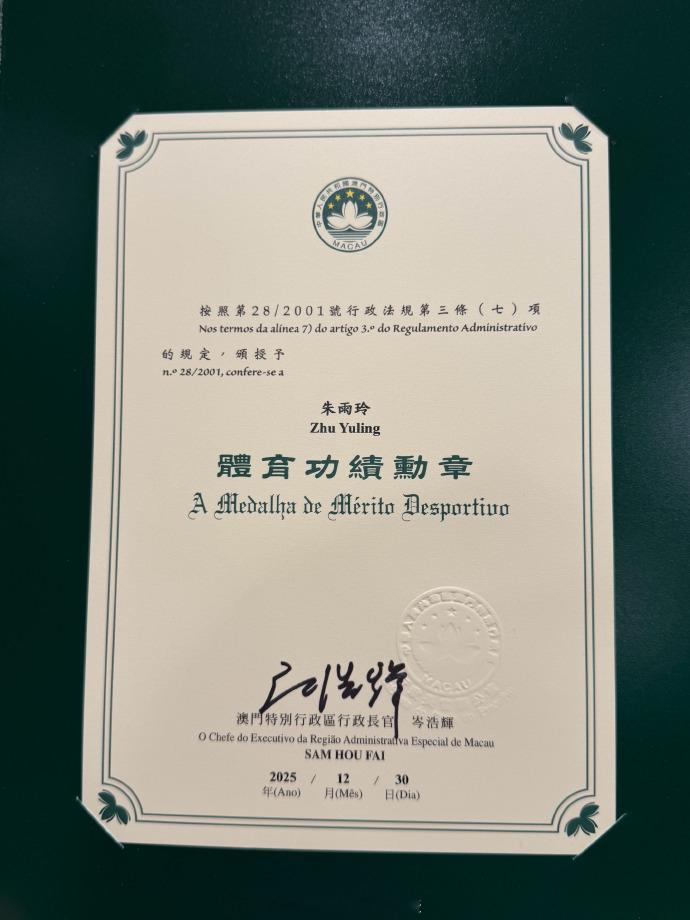 2026年1月30日,在中华人民共和国澳门特别行政区2025年度勋章、奖章和奖状颁授典礼上,中国澳门乒乓球运动员 获颁体育功绩勋章,该勋章为中国澳门特区七大功绩勋章之一,用以表彰在体育事业领域作出突出贡献的人士。