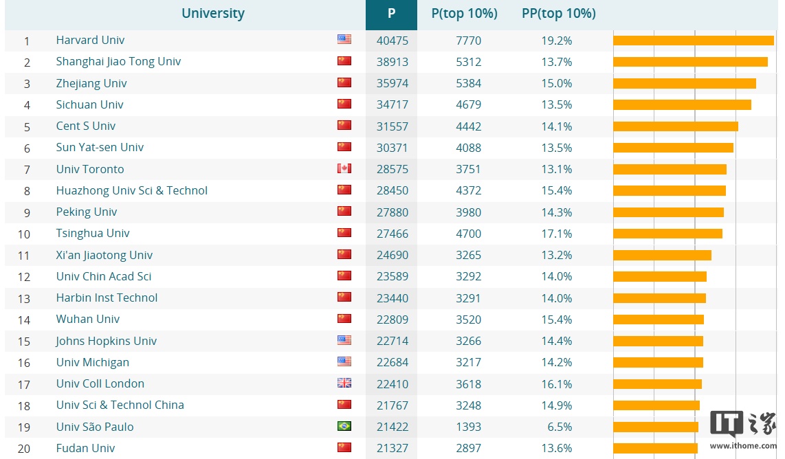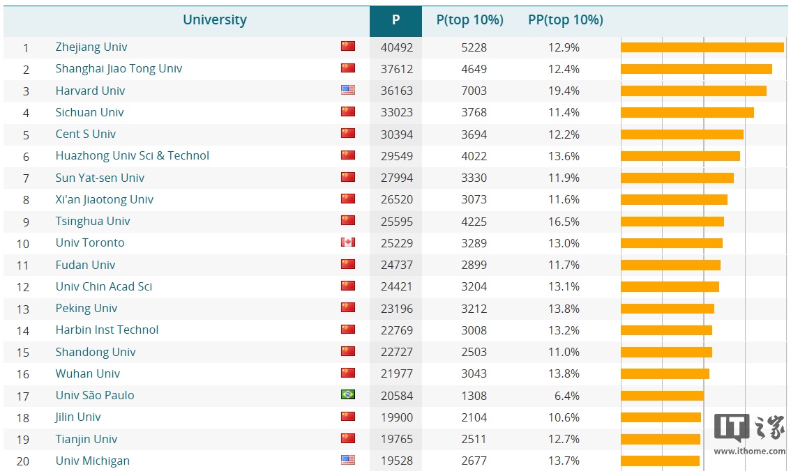 可以看到,浙江大学凭借40492篇核心出版物论文遥遥领先于其他大学;不过P(top10%)数据中美国哈佛大学依然一骑绝尘,达到7003篇,因此还是要正视差距,继续加油。