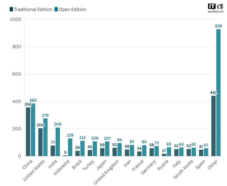 从上榜大学数量来看,不管是传统版还是开放版,中国大学依然排名第一,分别达到了356所和385所,美国上榜大学数量排名第二,印度第三。