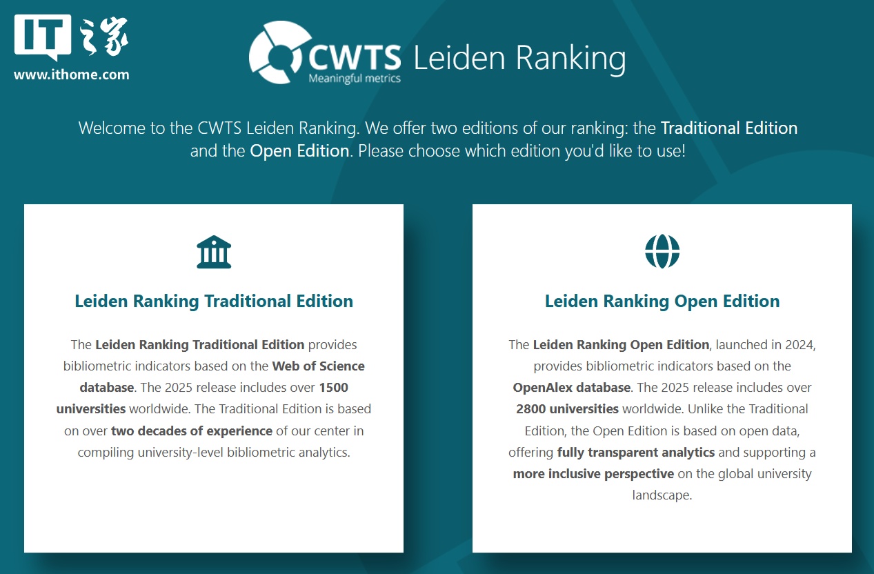 IT之家查询发现,2025年莱顿排名首次推出了一个“开放版”,纳入所谓的非核心出版物并纳入更多大学,这次哈佛大学当了第一,不过前十名中依然有八所中国大学。