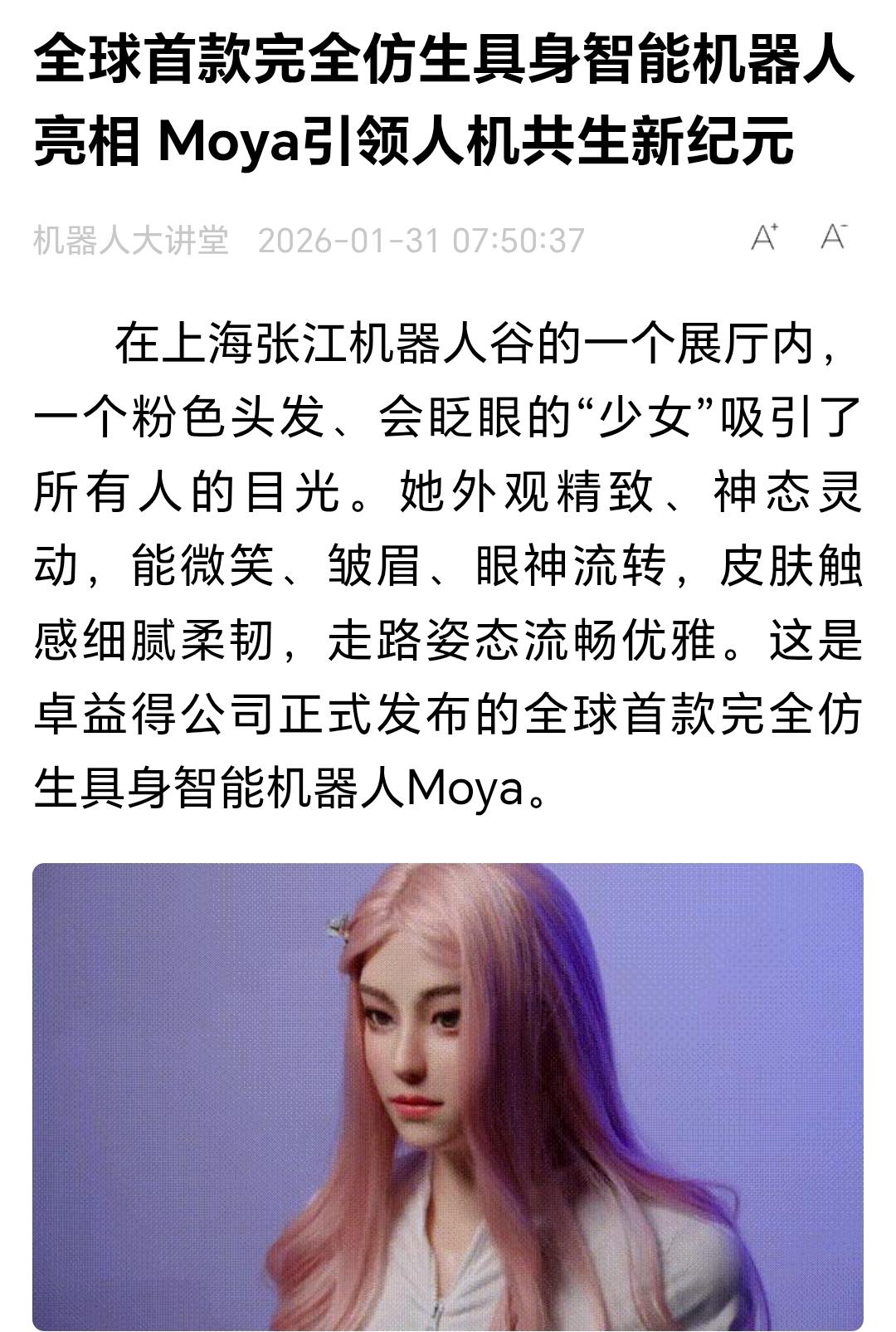 来,看看这个,你就知道在机器人和AI这个赛道,中美谁跑在了前面。 中国率先发布全球首款完全仿生具身智能机器人——摩亚MOYA。 简单来说就是完全像一个人一样的机器人。 人一样走路,一样拥有表情,一样思考问题,一样做事……总之,她就是一个人。 摩亚除了动作缓慢像一个刚学会行走和行动的孩子以外,没什么毛病。人都有一个学习成长的过程,我们要有耐心等待她的成长。 顺便说一句,卓益德,你们能不能从美院招一点设计师,这张脸不太好看,亲和力不够啊。看看隔壁家做3D打印的拓竹都招了很多艺术生。[偷笑] 点右上角关注我,我们一起去看这个魔幻的世界