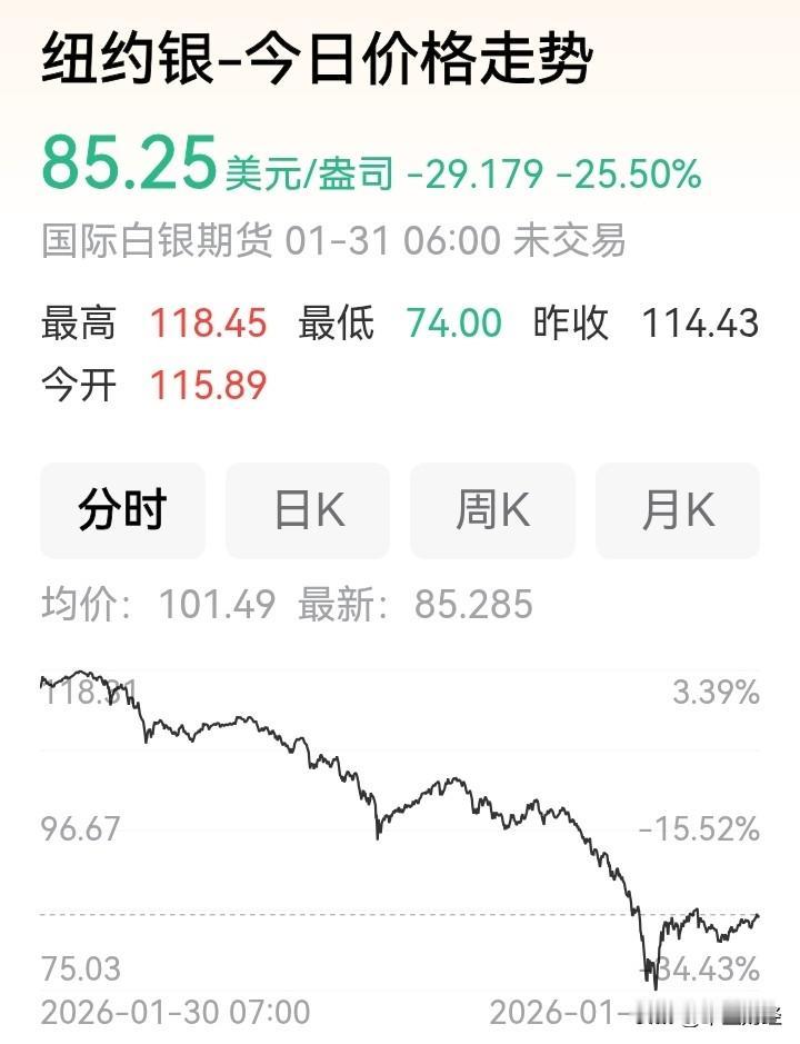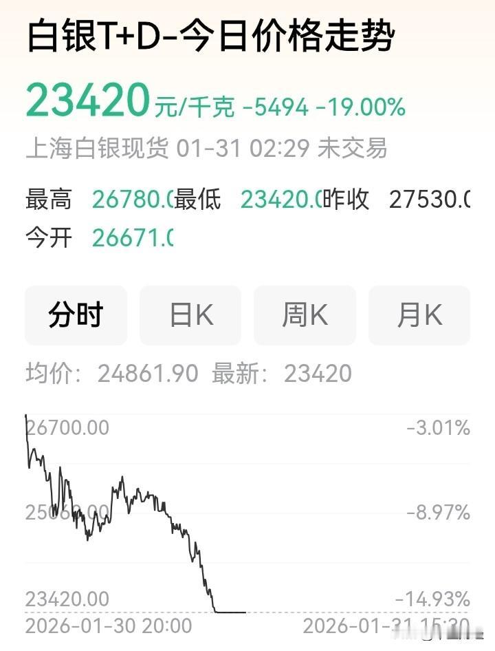【A股】国际黄金白银价格在2026年1月30日至31日遭遇史诗级暴跌,现货黄金一度跌破4700美元/盎司,最大单日跌幅超12%;现货白银更暴跌超35%,最低触及84.7美元/盎司。此轮暴跌已引发A股贵金属板块连锁反应,1月30日早盘,同花顺黄金板块指数跌幅一度超9%,近40只相关个股跌停或跌幅超10%。考虑到周末外盘继续下挫,市场恐慌情绪未平,预计下周一A股黄金白银概念股将延续大幅低开,部分前期涨幅过大、估值偏高的个股或再现大面积跌停走势。白银市场行情 黄金白银价格 白银价格行情 白银追跌 黄金白银