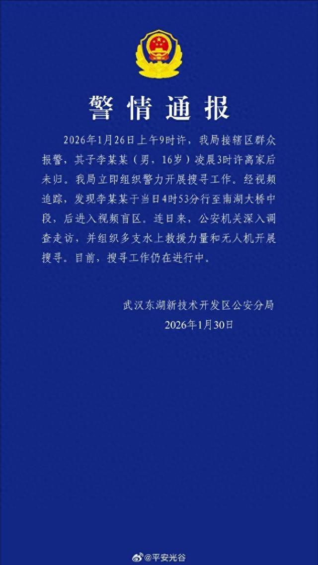 湖北16岁男生凌晨3时离家后未归,警方通报:其于当日4时53分行至南湖大桥中段后进入视频盲区,仍在搜寻都市报道2026-01-3014:55:31