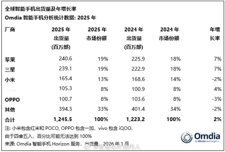 Omdia 2025全球手机销量同比增长2%,为12.45亿部。前10厂商分别为: