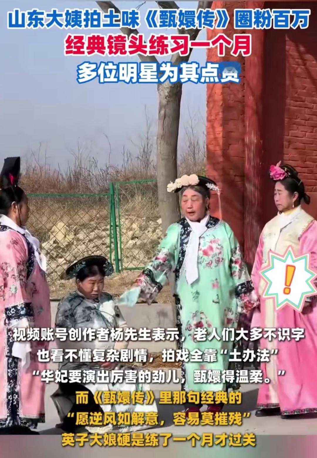 谁能想到,火遍全网的“土味甄嬛”,竟是群平均70岁的山东大爷大妈?玉米地当御花园,旧床单改旗装,三轮车充銮驾,打农药的喷雾器还能冒充宫廷香炉,这配置说出来都像玩笑。 可你不知道,68岁的英子大娘为了一句“逆风如解意”,硬是对着方言音译练了一个月,干活时嘴里都念念有词。老人们大多不识字,女婿导演就把剧情译成大白话:“华妃要凶,甄嬛得柔”,一个眼神特写能从上午拍到下午,腿麻了就蹲会儿再接着来。 三年拍了400多部作品,花10万积蓄买道具,不是为了当网红,只是农忙之余图个乐。可就是这份不带功利的认真,让他们收获百万粉丝,还被明道点赞、和原版《甄嬛传》剧组同框。 其实我们爱看的从来不是土味特效,而是这群老人眼里的光。他们用行动告诉我们:梦想不分年龄,热爱无关身份。生活或许平凡,但只要肯为喜欢的事花心思,哪怕在田间地头,也能活成自己的主角。