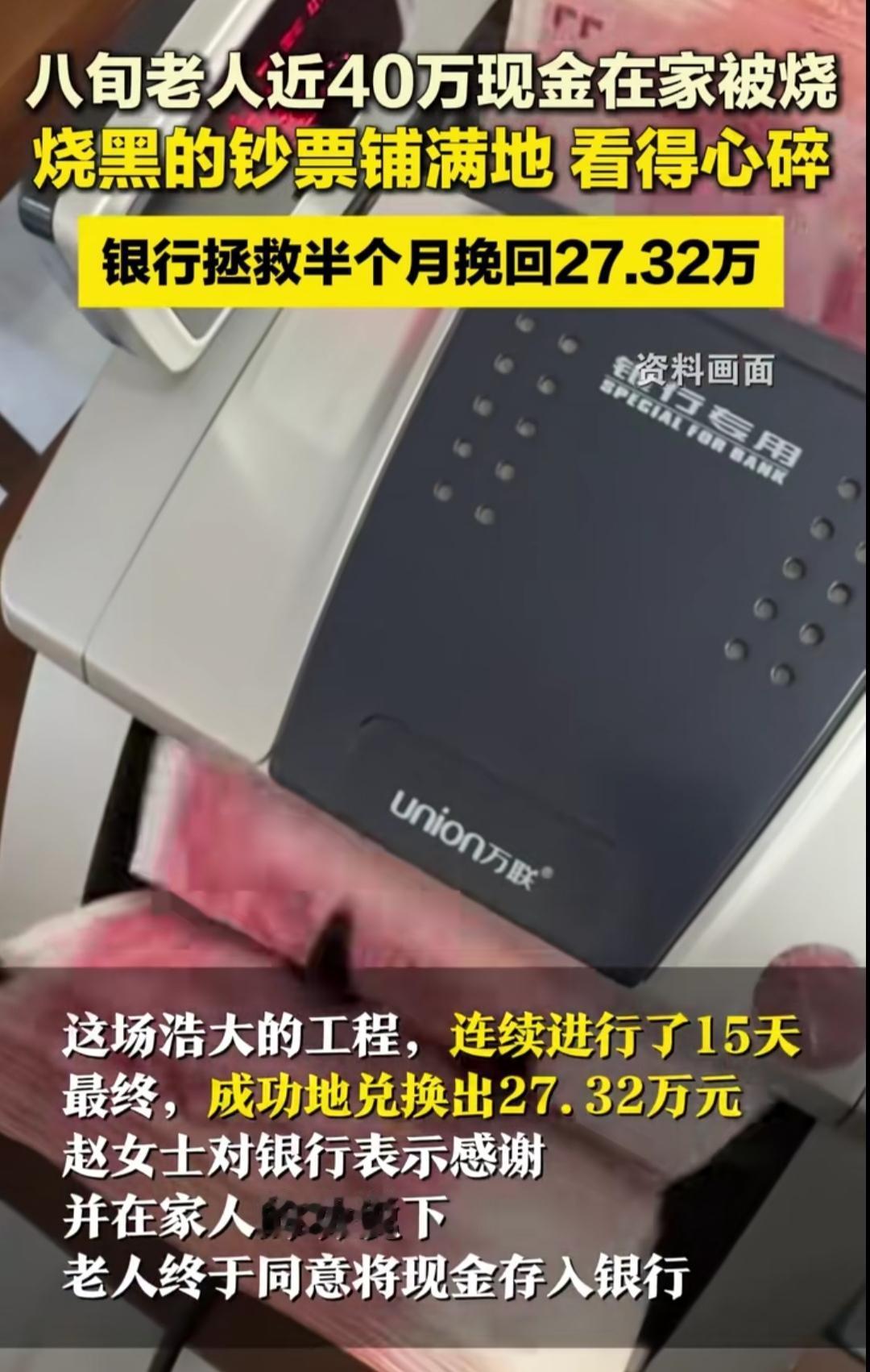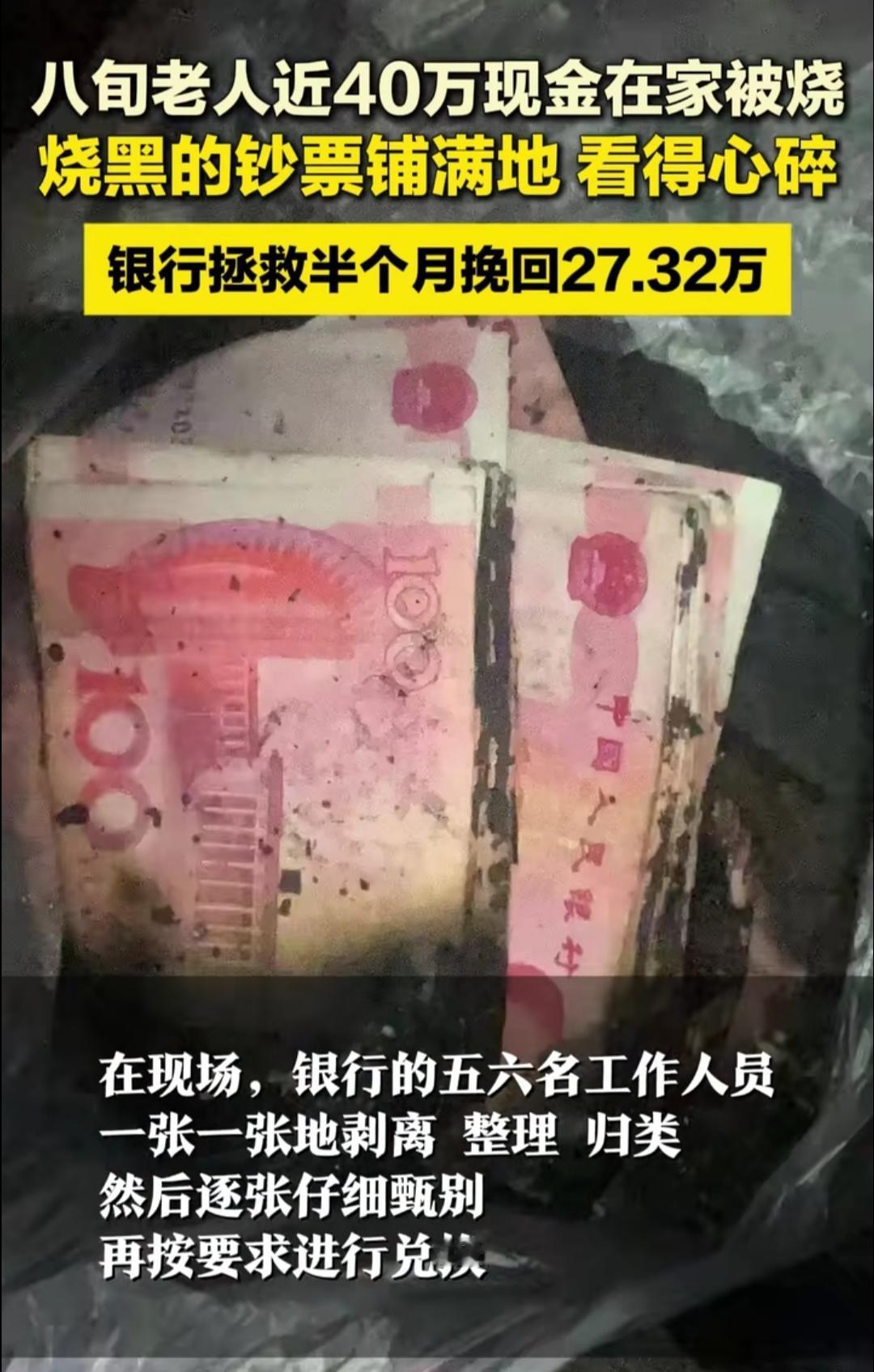 八旬老人半辈子攒下的近40万养老钱,一把火烧得只剩黑糊糊的纸灰。老人从牙缝里省出来的活命钱,买菜不舍得多花一分,添衣总拣最便宜的,就这么藏在家里角落,一场意外全成了泡影。看着满地焦黑的碎片,老人蹲在地上抹泪的模样,谁看了都忍不住鼻酸。 万幸的是,银行没撒手不管。工作人员硬是蹲了半个月,戴着口罩手套,用镊子一点点剥离、烘干、比对。他们对着残币兑换标准仔细甄别,哪怕只剩一小半的碎片都没放过,不放过任何一丝挽回损失的可能,最后硬是帮老人挽回了27.32万。 这事看着是个例,却戳中了很多老人的心事。他们不是不信银行,只是过惯了苦日子,总觉得钱攥在手里才踏实,怕手续麻烦,怕扣费,宁愿藏在箱底也不愿存进银行。可谁能料到,这份“踏实”,竟可能变成一场说没就没的心疼。