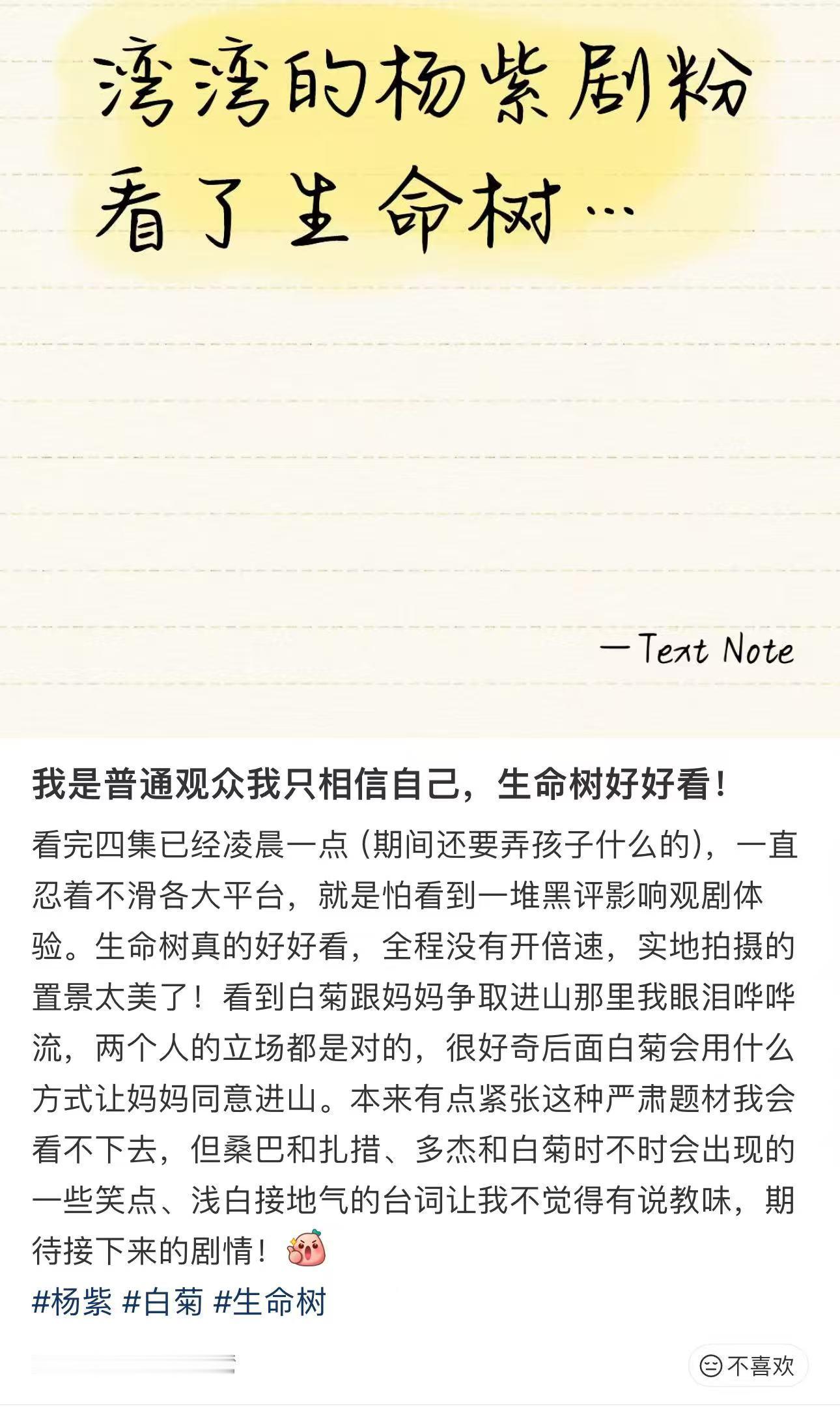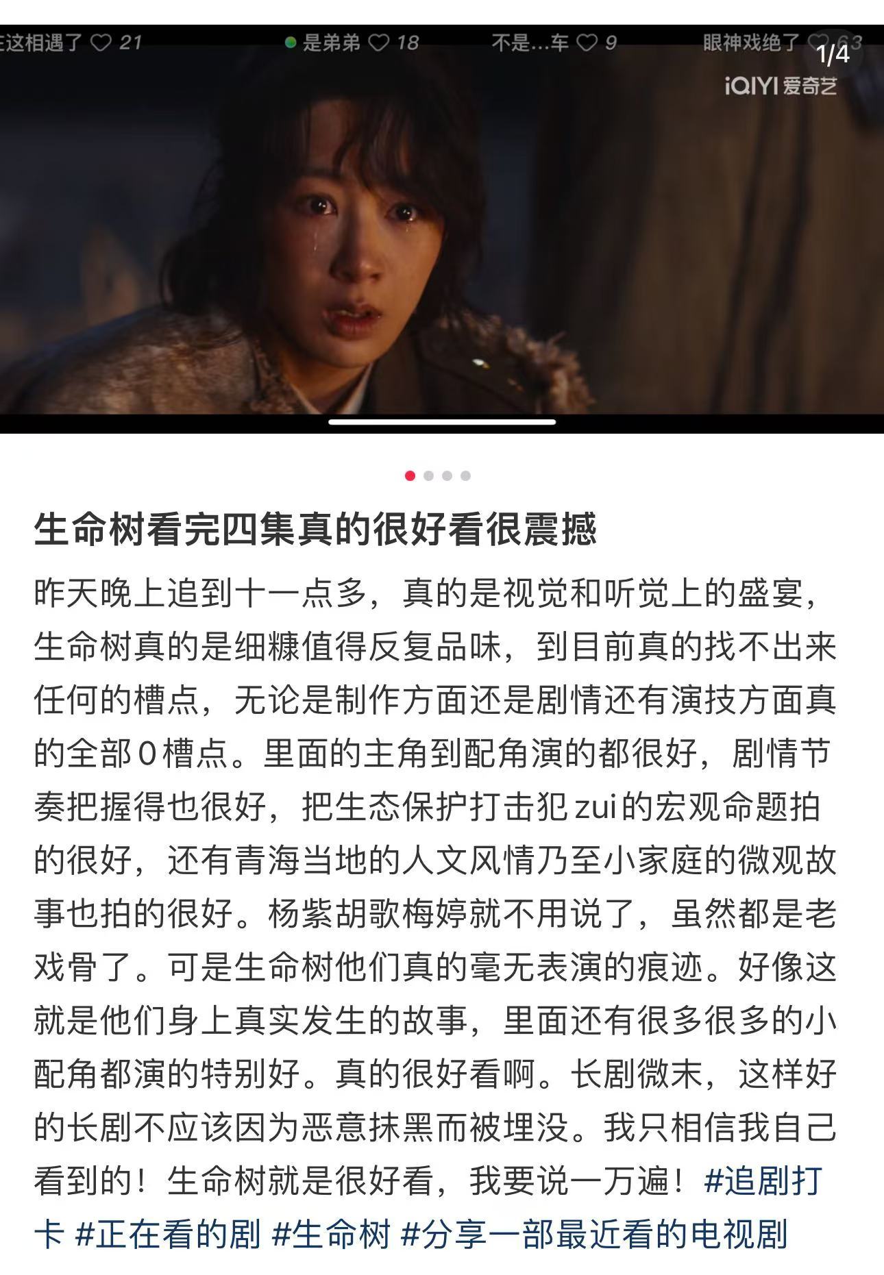 生命树观众路人repo:“正午阳光出品,质感直接拉满!” 实景拍摄的藏区风光每一帧都像电影,骑马戏、枪战戏看得紧张又刺激 杨紫把白菊的坚韧和柔软演活了,姐弟对峙的眼神戏张力拉满。 生命树第一波反馈