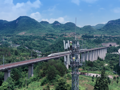 近一年来,这样的技术攻坚场景在贵州千里铁道线上不断上演。每一个满格信号背后,都是贵州移动网络建设者们与极端环境、技术卡点、有限时间的较量。在成贵高铁鸭池河特大桥上,他们身系安全绳,悬于300米高空、直面470米深峡谷,将基站精准架设云端;沪昆高铁贵阳以西段,面对喀斯特地貌难题,团队创新采用无人机勘测与地质雷达探测,打造“悬浮式”钢结构基站,成功破解地质沉降困境。