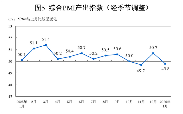 1月份,综合PMI产出指数为49.8%,比上月下降0.9个百分点,表明我国企业生产经营活动总体较上月有所放缓。