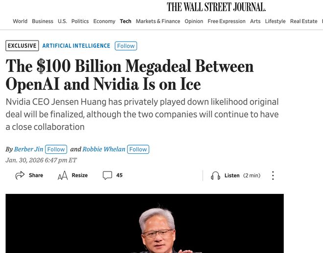 [环球网科技综合报道]1月31日消息,《华尔街日报》援引知情人士消息透露,英伟达原本计划向OpenAI投入最高达1000亿美元(约合6964.56亿元人民币),用于训练和运行最新人工智能模型,然而因公司内部出现质疑声音,这笔备受瞩目的交易目前陷入停滞状态。