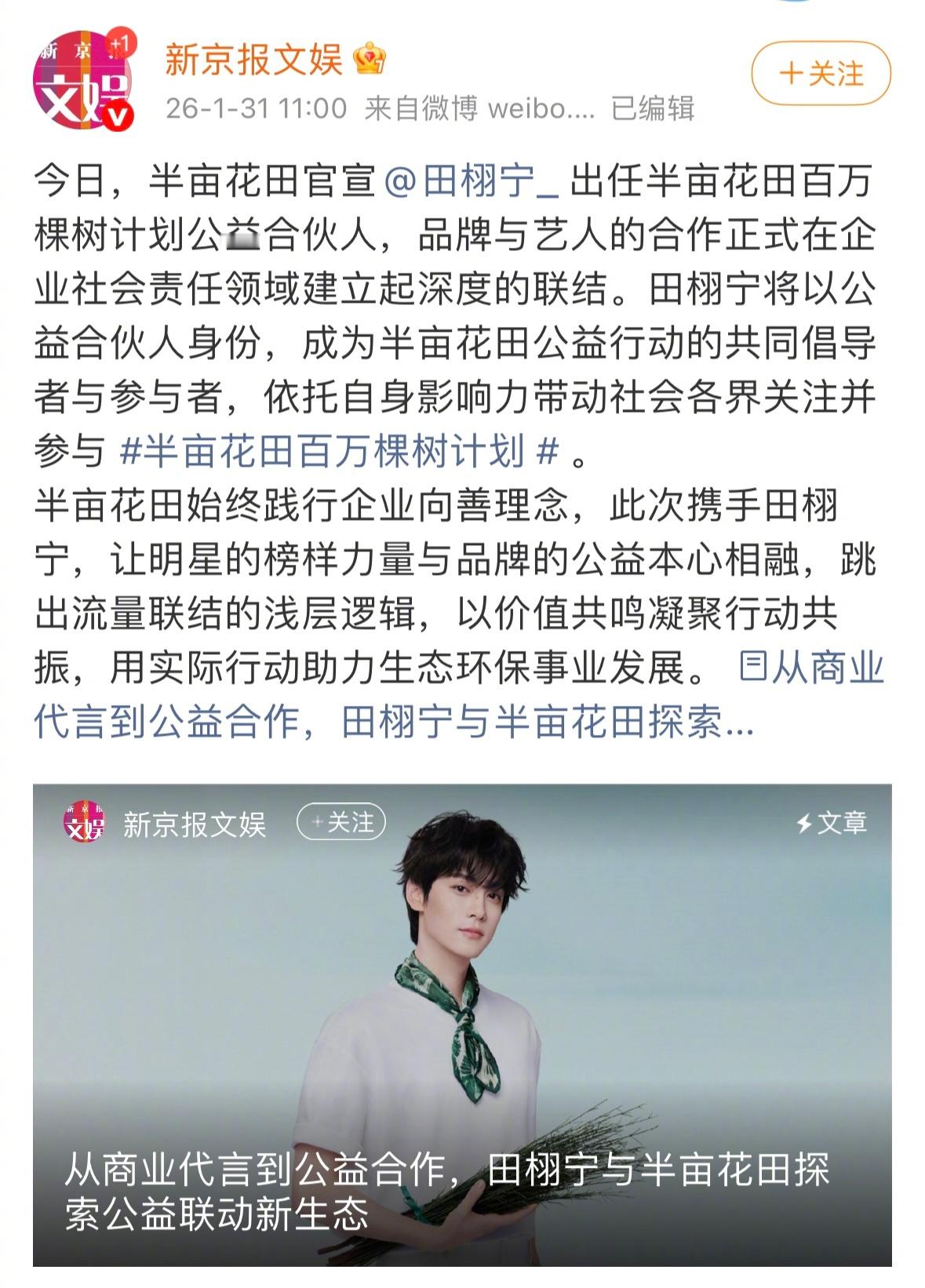 田栩宁说真的很香 半亩花田这波对全新代言人田栩宁的宠爱排面真是拉满,不仅铺了超多地广和线下投放,而且半亩花田还官宣了田栩宁为半亩花田百万棵树计划公益合伙人,在合作上有了更深、更有意义的联结可以看出品牌霸霸对田栩宁好有诚意,也是十分认可他的个人商业价值,这次双向奔赴的含金量谁懂啊