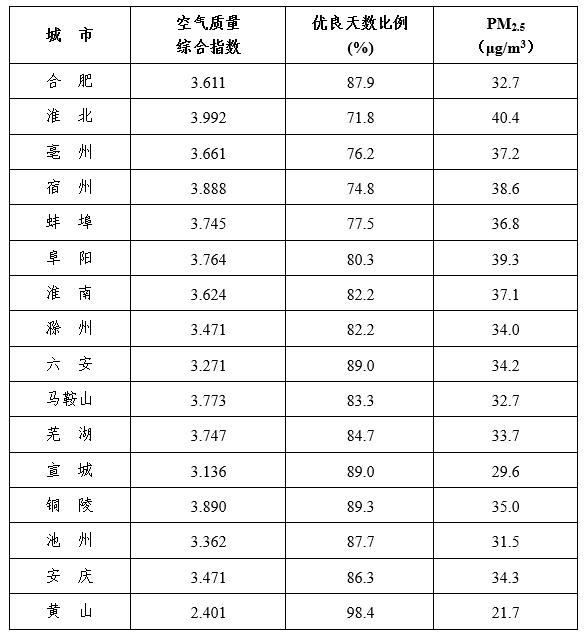 全省16个地级市中,空气质量综合指数位列前三的城市是黄山、宣城、六安;优良天数比例位列前三的城市是黄山、铜陵、六安、宣城,其中六安、宣城并列第三;空气质量综合指数变化程度较好的前三个城市是亳州、淮南、滁州。其中,黄山市表现突出,以2.401的综合指数、98.4%的优良天数比例和21.7微克/立方米的PM2.5浓度,三项核心指标均位列全省第一。