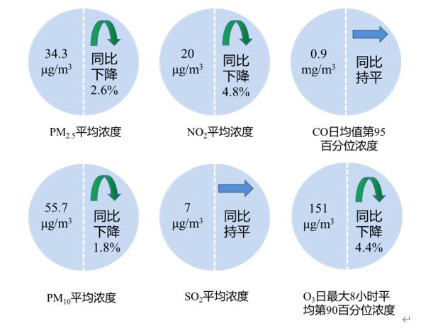 数据显示,全省全年平均空气质量综合指数为3.552,同比下降3.5%;优良天数比例为83.8%,同比上升1.6个百分点;PM2.5平均浓度为34.3微克/立方米,同比下降2.6%;PM10平均浓度为55.7微克/立方米,同比下降1.8%;NO2平均浓度为20微克/立方米,同比下降4.8%;SO2平均浓度为7微克/立方米,同比持平;CO日均值第95百分位平均浓度为0.9毫克/立方米,同比持平;O3日最大8小时平均第90百分位平均浓度为151微克/立方米,同比下降4.4%。