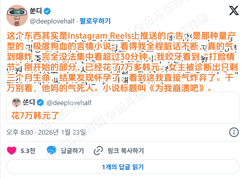 看一本垃圾小说已经花了3万韩元了,我也没法让我自己停下来 海外新鲜事 热点现场