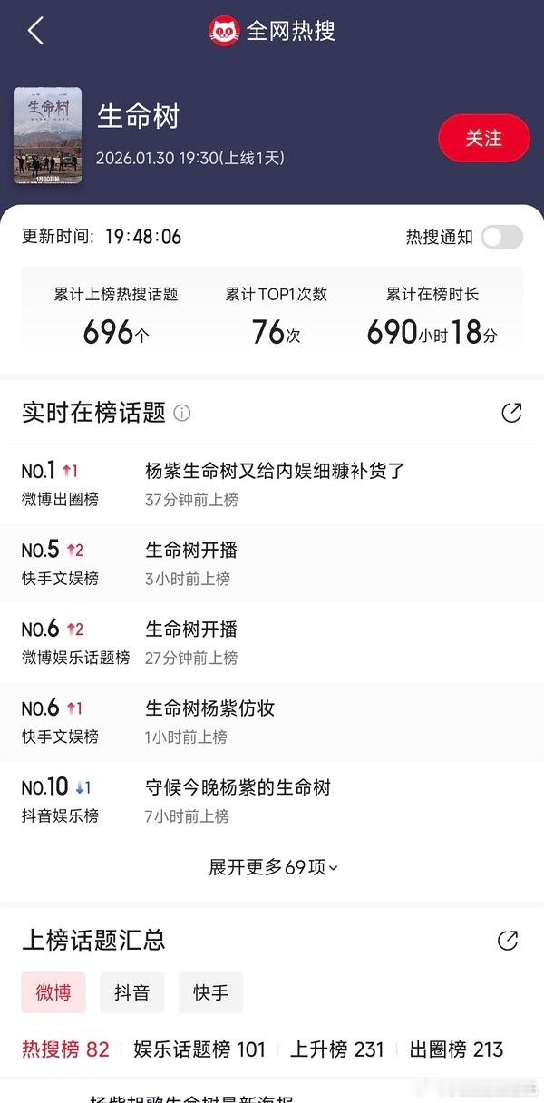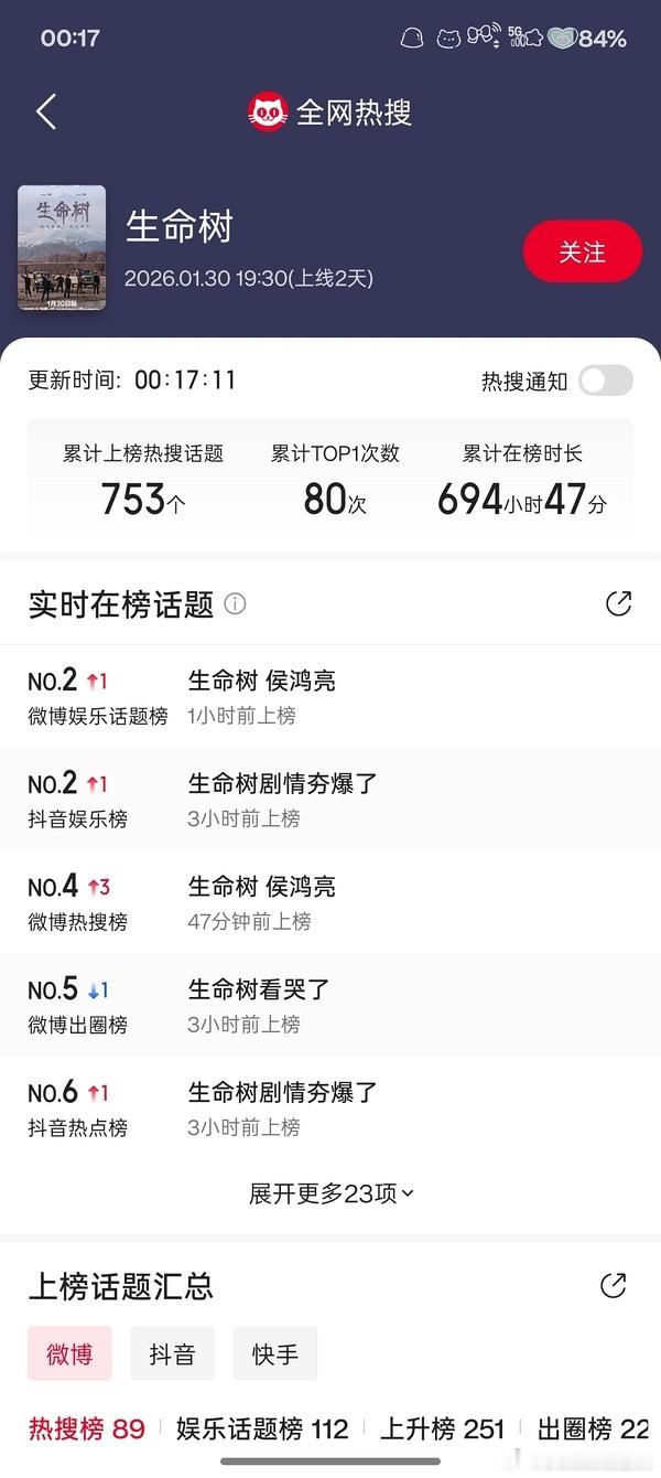 早上刷抖🎶,已经刷到4个影视博主解说《生命树》红稿…平常不咋能刷到影视类的,除非特别出圈的梗~原来《生命树》开播前热搜696个昨天首播一晚上+57个……