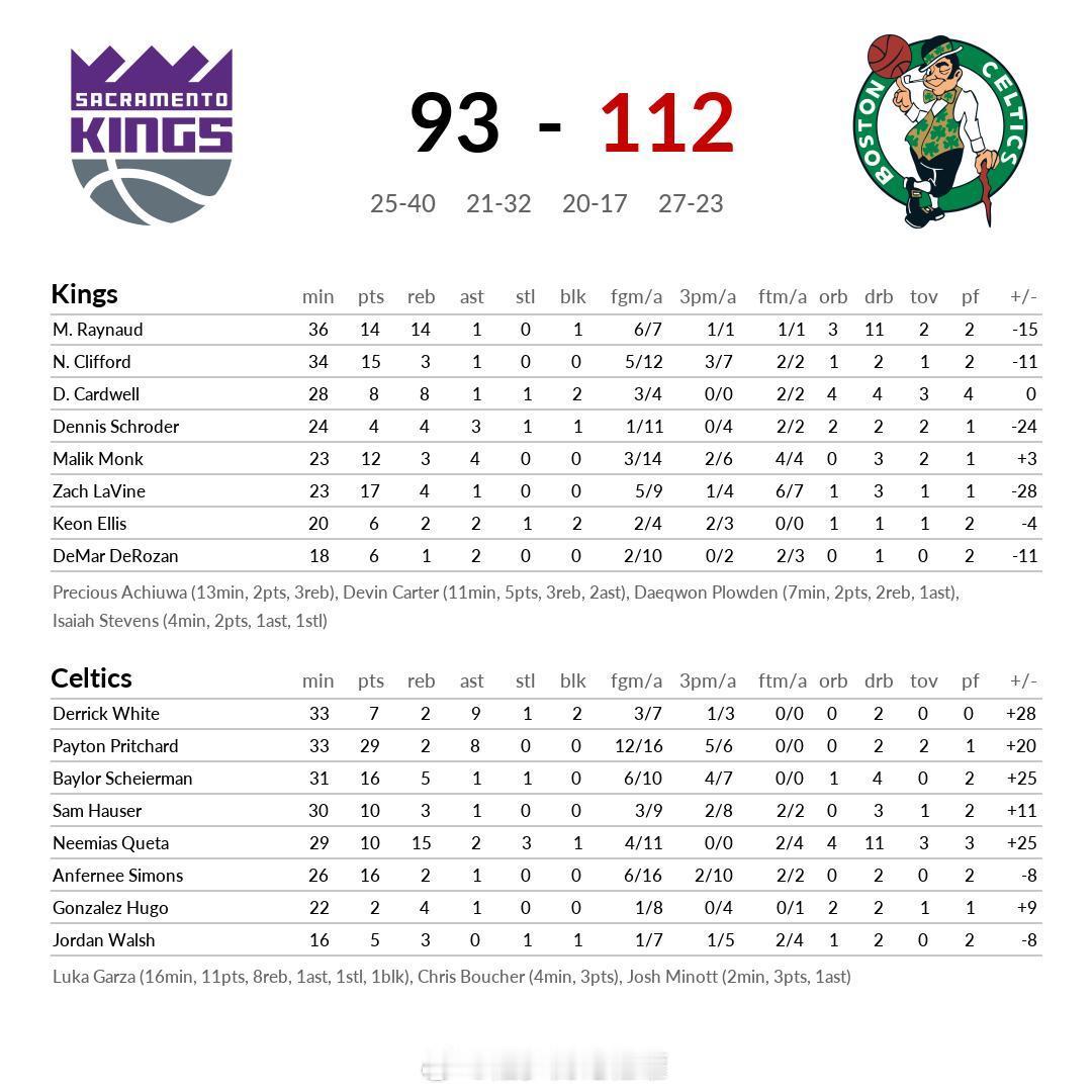 佩顿-普里查德29分2篮板8助攻贝勒-沙伊尔曼16分5篮板内米亚斯-克塔10分15篮板3抢断德里克-怀特7分9助攻安芬尼-西蒙斯16分2篮板卢卡-加尔扎11分8篮板