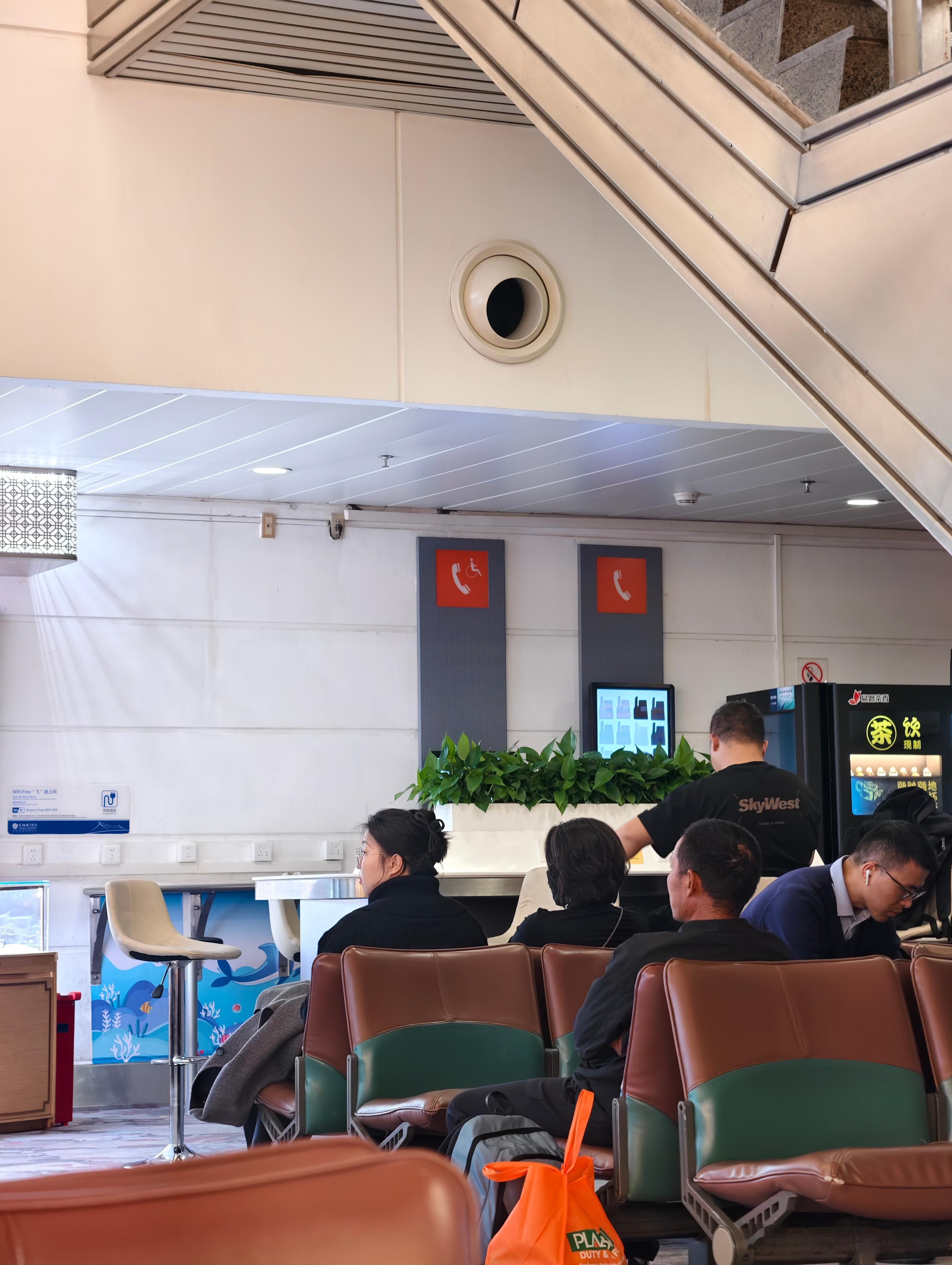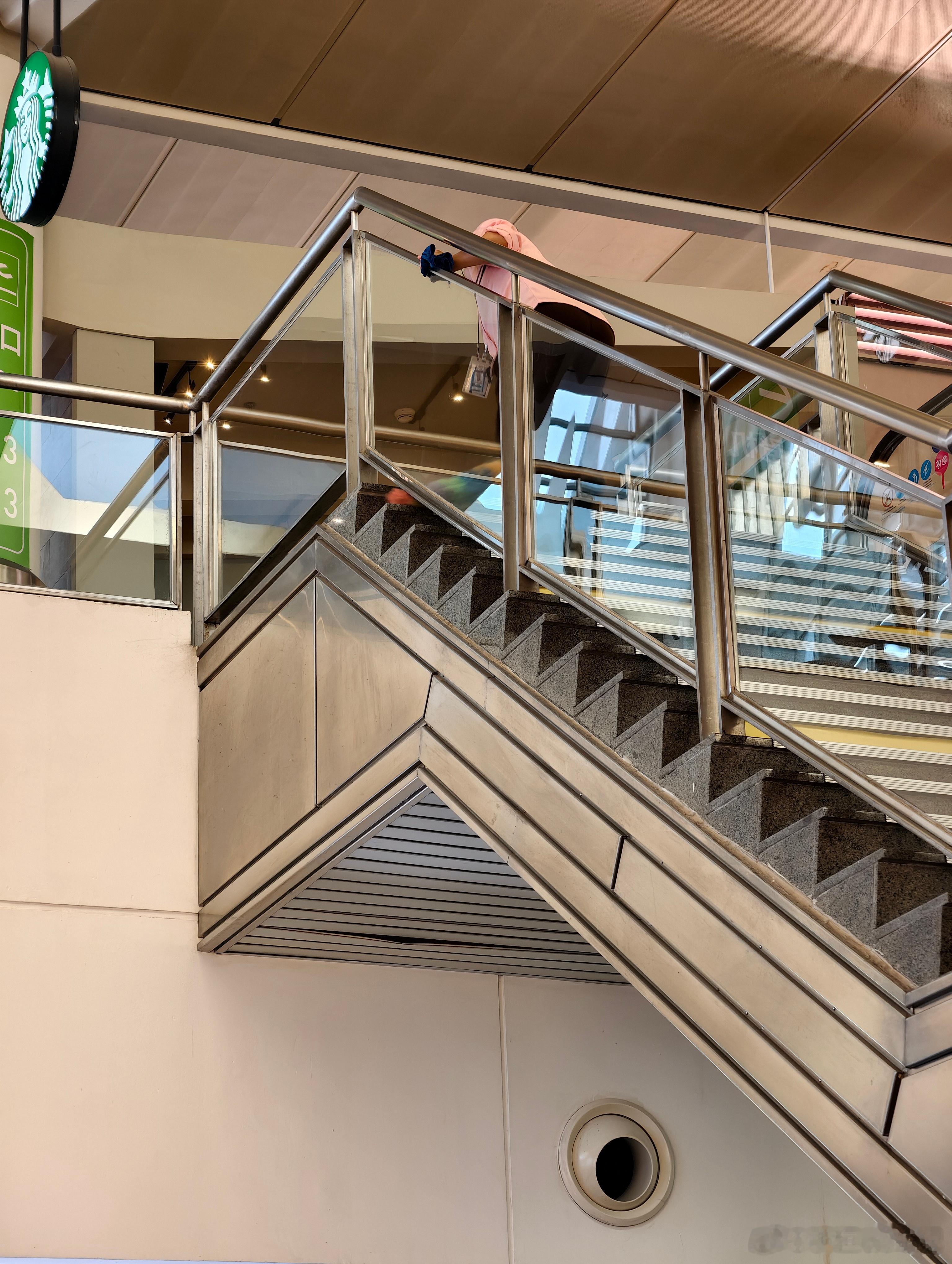 这大姐拿着鸡毛掸在楼梯上一层一层的扫栏杆下的灰尘挺辛苦,就是可怜了坐在下面的旅客,灰尘飘下来估计多少会弄到身上头上一些。