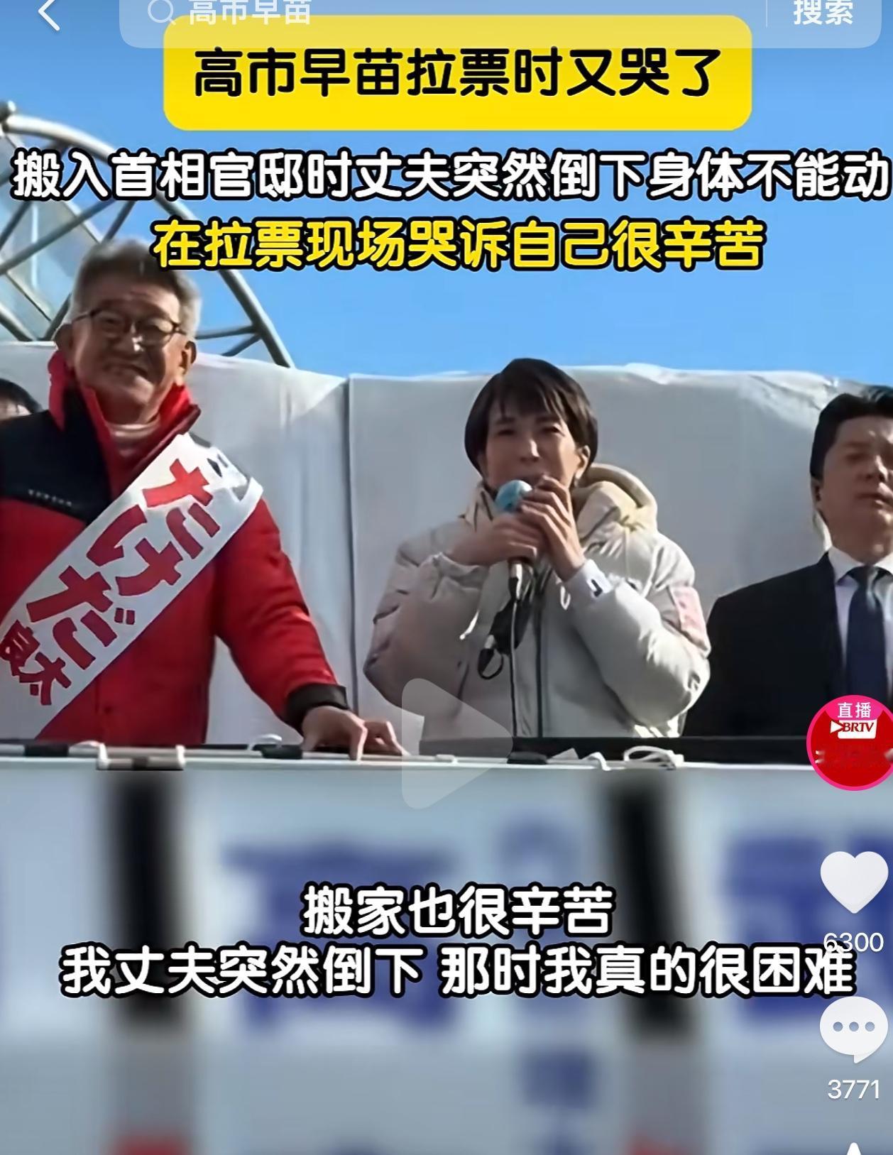 高市早苗再一次伤心落泪 1月30日,日本首相高市早苗在参加一场拉票演讲时,再次留下了伤心的泪水,她向人们诉说着自己的不易,包括最近搬入首相官邸时,丈夫突然发病倒地,身体无法动弹。高市早苗手足无措,一时感到很伤心。 1月27日,高市早苗在参加另外一场拉票演说时,曾经情绪失控,当场落泪。她表示:自己咬牙苦苦撑了30多年才登上首相宝座,几十年来真的不容易,希望日本民众给予理解与支持。 可惜的是高市早苗的眼泪并没有赢得现场人们的同情,反而被嗤笑。一位站在高市早苗旁边的工作人员掩饰不住发自内心的微笑。大家都一致认为高市早苗的表演功夫的确很深。