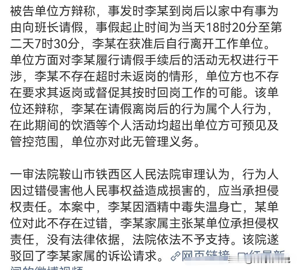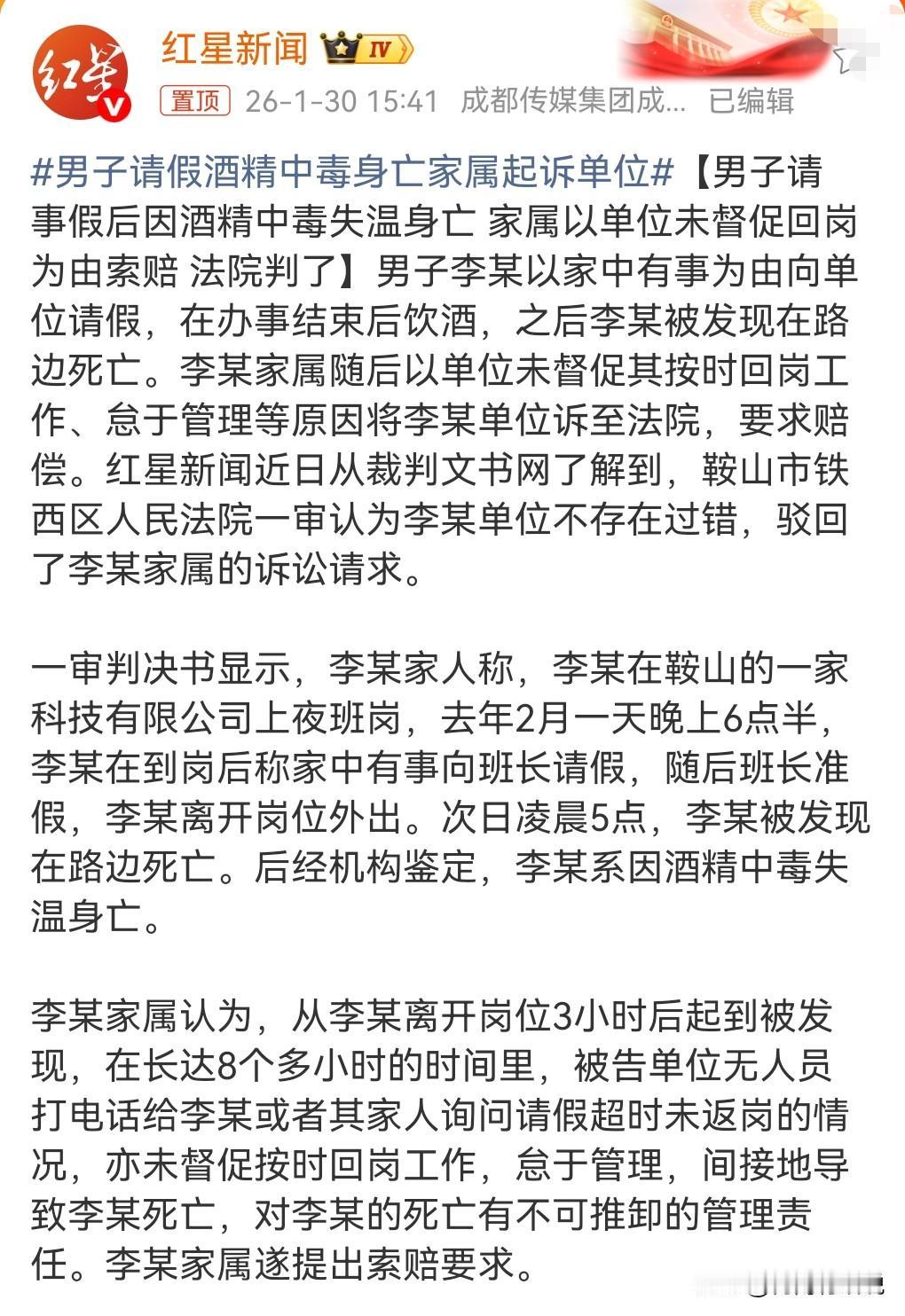 这要是能够得到法院的支持,那就奇了怪了,法院的判决很合理,驳回了。 1月31日报道这么一起案件。 一男子请假,然后办完事后去喝酒,结果死亡了。 结果男子的家属把公司告上法庭,说公司没有及时催促男子返岗。 这也太离谱了吧。 法院肯定不会支持男子家属的。 这要是不能怪公司的话,那真的是太离谱了。