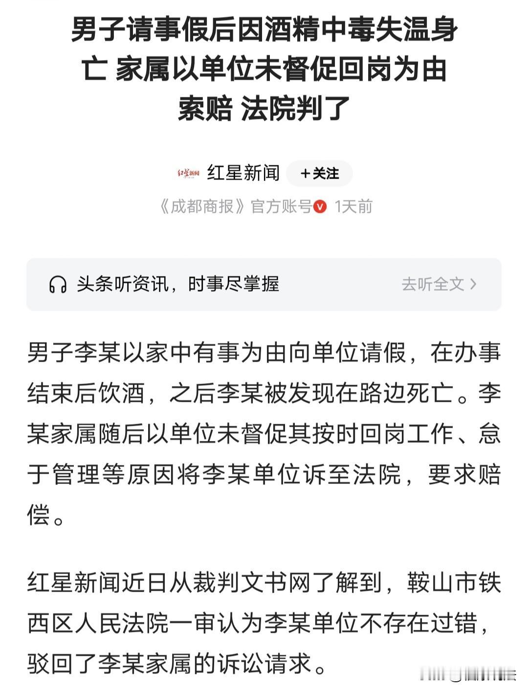 “讹天讹地讹空气!”辽宁鞍山,男子跟单位请假,说家里有事,单位批准。次日,男子被人发现死在路边,经鉴定是酒精中毒失温死亡,不料,家属怪单位没打电话问问男子的情况,没催他到岗,间接导致男子死亡,要求单位赔偿。单位喊冤:他还没到返岗时间呢,我们无权干涉他个人活动,法院判决亮了。 李某在当地一家科技有限公司上夜班,平时工作也挺踏实。可谁能想到,一次普通的请假,竟引发了家属和单位的一场纠纷。 2025年2月的一天晚上,6点半刚过,李某像往常一样到岗准备上夜班。 可刚坐下没多久,他就皱着眉头跟班长说:“班长,我家里有点急事,想请个假,出去处理下。” 班长看他神情焦急,也没多问,大手一挥就准了假。 李某收拾了下东西,急匆匆离开了岗位。 这一走,命运却在此刻悄然埋下了悲剧的种子,李某此后再也没回来。 第二天凌晨5点,天还蒙蒙亮,路上的行人寥寥无几。 寒风凛冽的街头,一位早起赶路的行人偶然间发现了蜷缩在路边、浑身冰凉的李某。 行人惊慌失措,赶忙拨打了急救电话,可当救护车风驰电掣般赶到时,李某早已没了气息。 可遗憾的是,李某被送到医院也没有救过来,后经过鉴定,李某的死因是酒精中毒导致失温。 李某的家属得知这个噩耗后,悲痛欲绝。 他们怎么也想不明白,好端端的一个人,怎么说没就没了?冷静下来后,李某家属们开始琢磨这事儿,觉得单位有责任。 李某家属理直气壮的说:“从李某离开岗位3个小时后,一直到被发现,整整8个多小时啊!单位居然没一个人给他或者我们家人打个电话问问情况。 要是单位能督促他按时回岗,说不定他就不会喝这么多酒,也就不会冻死在路边了。这单位就是怠于管理,对李某的死有不可推卸的责任!” 于是,李某的家属一纸诉状将单位告上了法庭,要求单位赔偿损失。 单位这边接到传票后,也是一肚子委屈。他们说,事发那天,李某到岗后确实请了假,请假时间从当天18时20分到第二天7时30分。 李某请假获准后,他自己离开了单位,我们对他请假之后,去干什么根本就无权干涉。 而且,李某请假的时间尚未到期,根本不存在超时未返岗的情况。 员工在请假之后的私人时间,公司既没有权利,也没有道理去横加干涉。 李某在请假后与朋友喝酒的行为,纯属个人行为,与公司毫无瓜葛,总不能让公司管天管地,连员工下班后的饮酒什么的都要过问吧。 双方各执一词,互不相让。 说句公道话,李某请假出去喝酒出了事,家属不能啥锅都往单位身上甩。 员工请假后就相当于“下班自由”了,自己出去喝酒出事,怎么能怪单位没打电话催?要是单位管得这么宽,估计又有人要吐槽“公司管得比爹妈还多”了。 换个角度想,家属的心情能理解,好好的人没了,总想找个“说法”。 家属是想把本该由个人承担的风险转嫁给单位。亲人意外离世确实可怜,但也得从客观事实来看。 感情归感情,法律归法律,单位的管理责任不是无限的,总不能要求老板24小时盯着员工的一举一动。 李某是去请假办私事,而且是个有独立行为能力的成年人。他在请假期间去喝酒,这完全是个人隐私和自由,公司要是真像家属说的那样,隔三差五打个电话催他回来,那不叫负责,那是侵犯员工的私人空间。 要是这次判单位赔了,那以后哪个单位还敢批假?员工出去逛个街、约个饭,单位是不是都得每隔一小时打个电话查岗?这不现实,也不合理。 再说了,成年人得为自己的行为负责。 喝酒喝到酒精中毒失温,这是自己对自己的身体不负责,家属不能一出事了就找别人兜底。 当然,要是单位真的有过错,比如没批假就让员工走,或者明知员工有危险却不管,那该担责就得担责,但这事里单位确实没做错啥。 《民法典》第1165条,行为人因过错侵害他人民事权益造成损害的,应当承担侵权责任。 本案中,李某请假离开了单位,他的个人活动不在单位管理范围内,单位对其请假后去做了什么没有管控义务。 另外,李某死亡原因与工作无关联,单位不存在过错,故无需承担侵权责任。 最终,法院判决:驳回李某家属的诉求。 这个判决也给所有人提了个醒:别把责任边界搞混了,该自己扛的责任,就得自己扛。