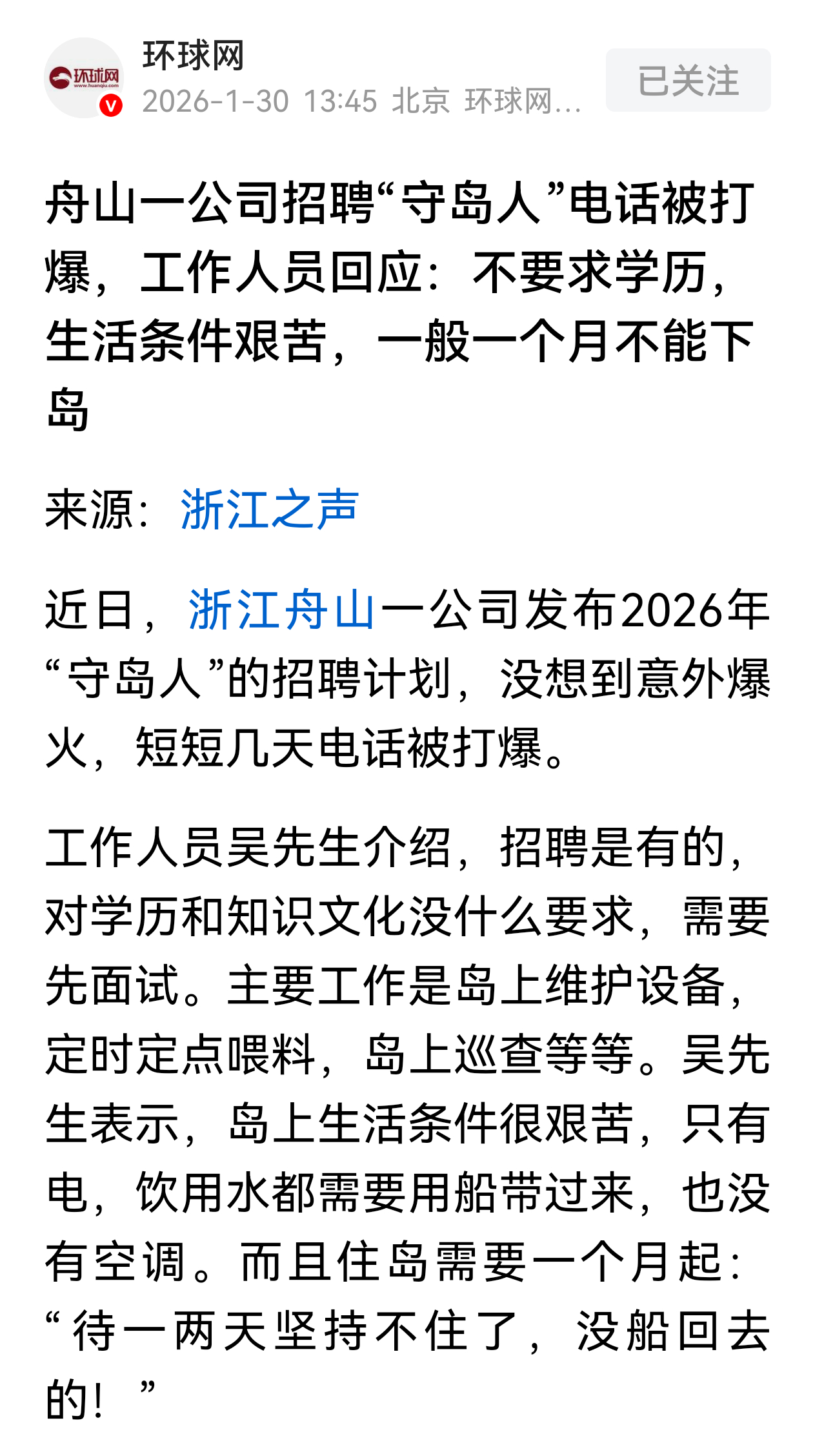 招聘守岛人不限男女但不能一男一女 对有些张口就说找不到工作的人来说,这不失为一个