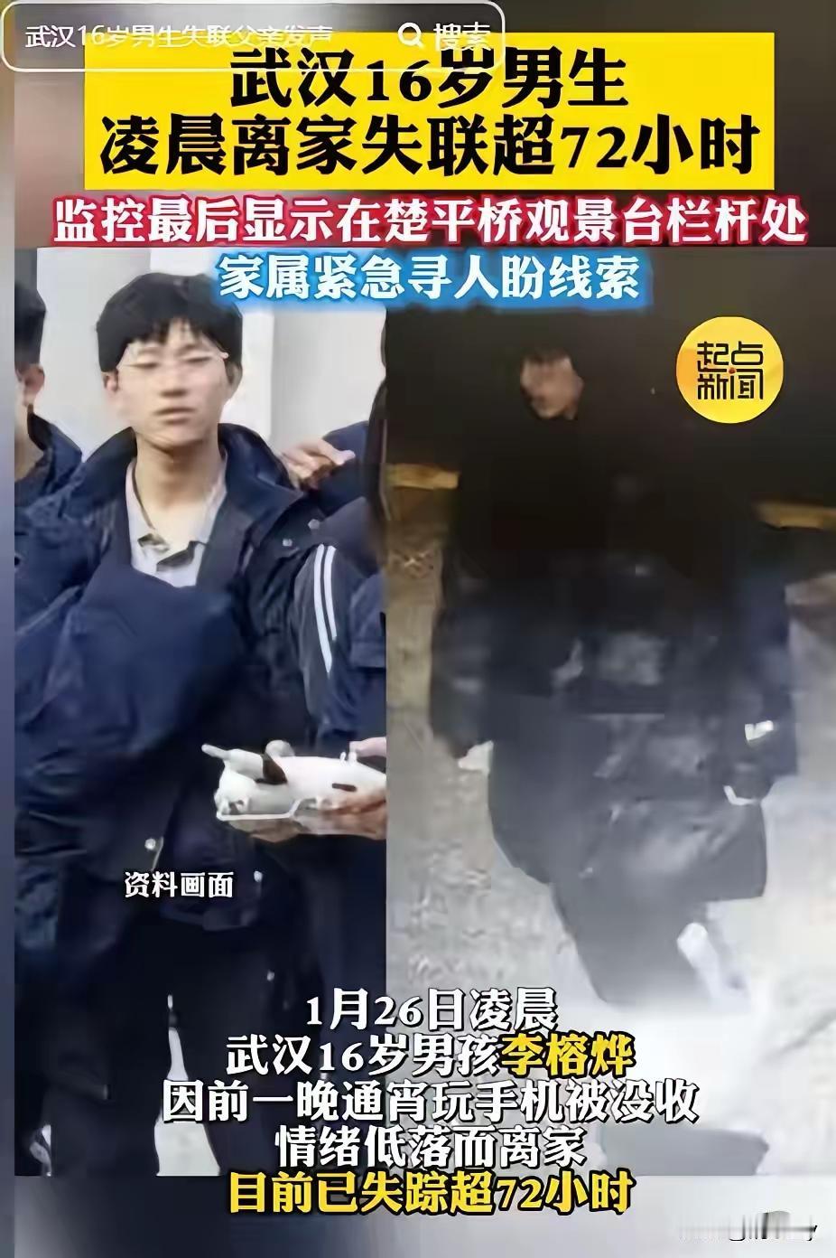 又是手机!武汉16岁高中生李榕烨因为周末通宵玩手机,父母一生气把手机给没收了! 1月26日凌晨孩子半夜趁父母睡着后,独自离家出走了,目前失联已经超过5天时间! 当天是周六,父母发现孩子通宵玩手机后,就把手机给收了,当时孩子也没说什么,只是谁也不理,周日还玩了一天的电脑! 广西的朋友:我读初三的儿子昨晚说三天不交手机,我们不同意就闹开了,什么脏话都骂的出来。把自己关在房间嘻嘻哈哈跟他朋友边聊天边游戏。还说如果断网断卡就把我们手机电脑全摔了。 从小陪伴长大,既不算太严格,也没有放任,小时候的兴趣班都是尊重他自己意见,现在翻旧账认为是我们逼的。反正自己的一切不好都是父母造成的。跟他好好沟通,他说话就一直阴阳怪气。 上了初中,性子完全变了。就想着熬到他18岁,赶不走他,我自己出去。 国家应该严控游戏,从利益出发,挺好,但从育人的角度以国家的未来考虑,应严控游戏,误了多少好子弟。🤦🤦 孩子打游戏,晚上不睡觉,整天迷迷糊糊的,父母只有把手机收了,结果孩子不理解父母,而怨恨父母,离家出走,以此来威胁父母的,实在不少!孩子离家出走也好,让TA尝尝没有钱寸步难行的艰难,TA或许以后就知道自己该怎么活了。少年不识愁滋味,长大就不会是个成熟的人,甚至一辈子,都是迷迷瞪瞪地过。 有人说上苍给你什么样的孩子就是什么样,我一亲戚两口子在县域电厂的上班,家在西安,孩子一个人在西安上初中、高中,夫妻两个上倒班时抽空回家,孩子特别自律,没有手机,更别说玩游戏了,高考考上一所华东985、211院校,博士上的清华,要是这位家长的孩子,可能早就放飞自我了,所以说,该是什么样就是什么样,上苍注定的。 你家孩子的自律,是建立在你们没有给他手机的基础上的。给了孩子手机,基本不会自律了。 游戏害死了很多孩子,我家孩子也被游戏害的得了忧郁症。 以前孩子业余时间,去公园玩,滑旱冰,去游戏厅,或者在家打电子游戏,爬山,钓鱼,不管干什么都不能一直坐着不动,,,现在一个手机,枯坐一天。 一开始年龄小的时候就立规矩,每天只能玩一个小时或者两个小时,时间到了必须放下手机,该打就要动手,这样才能有威严,让孩子尊敬你,怕你。要是做不到后面年龄大了就真难管了。 湖北的朋友表示:我儿子四年级,刚刚跟他说,中午饭吃了写作业,他答应了,估计他写个一两面,又会玩平板。他不是国之栋梁的料,就承欢膝下吧!
