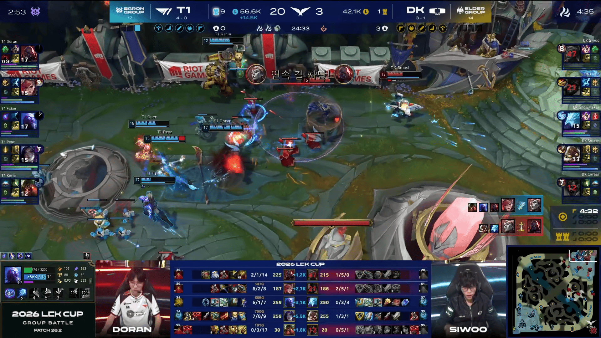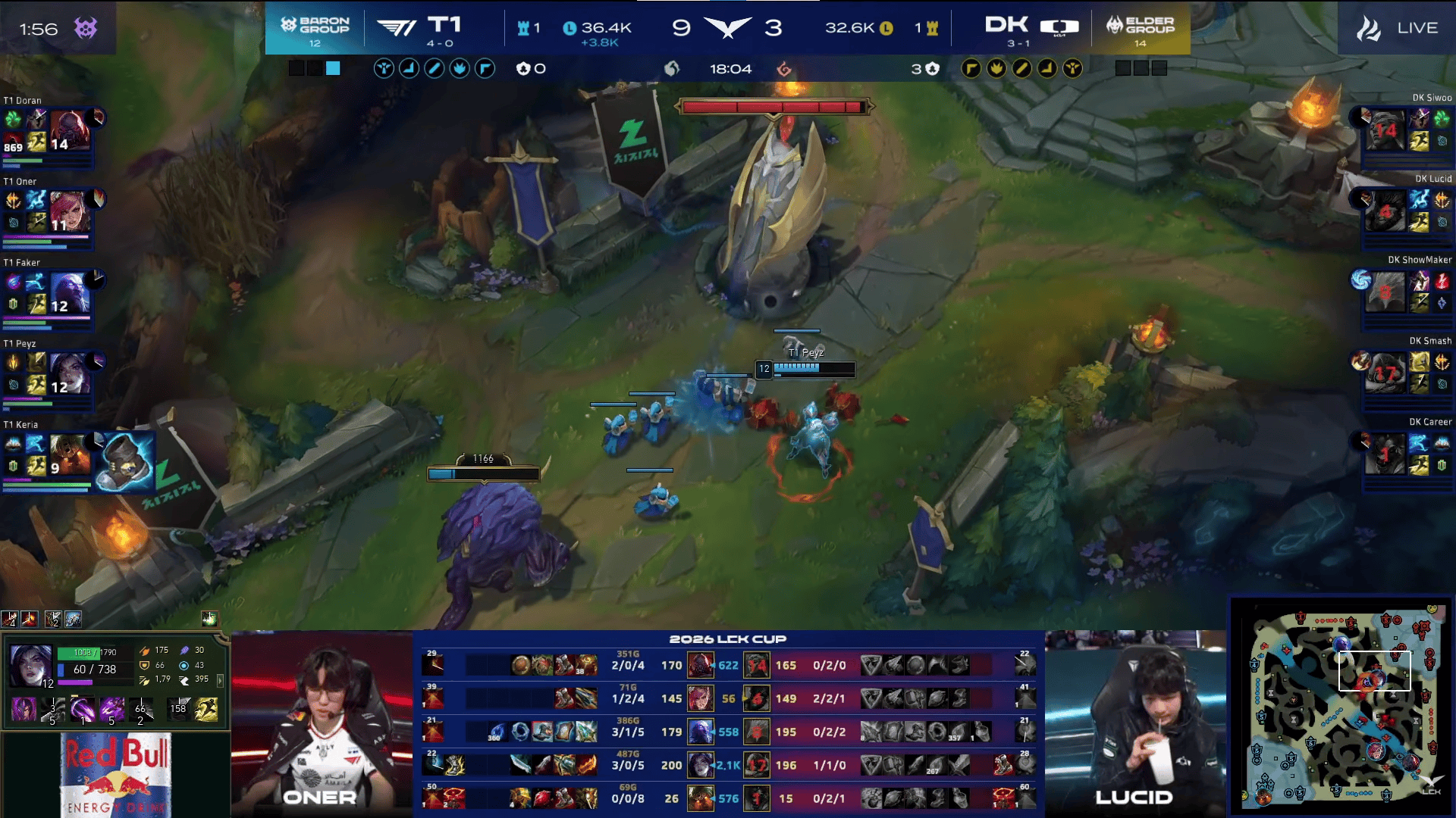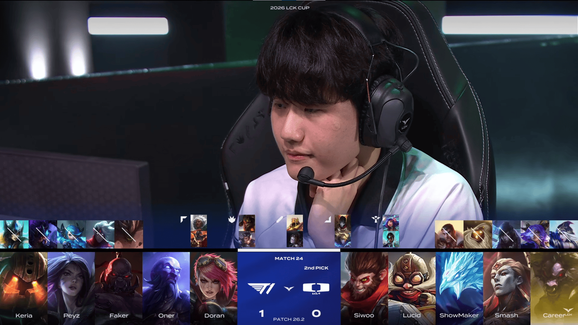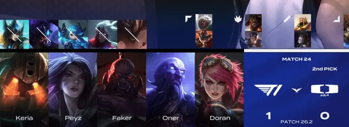 T1选用:Doran塞恩、Oner蔚、Faker瑞兹、Peyz卡莎、Keria泰坦